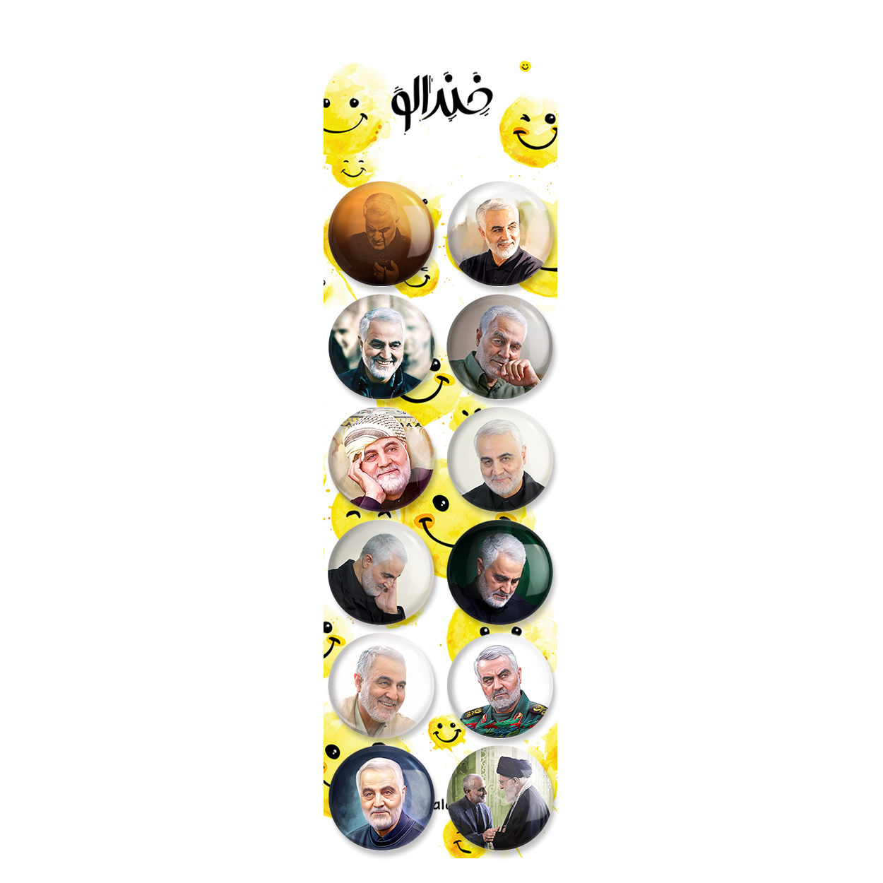 پک 12 عددی پیکسل خندالو طرح حاج قاسم سلیمانی با روکش سلفون حرارتی براق ضدخش و قطعه پشتی رنگی تولید شده است. قطعات پشتی از میان 6 رنگ سفید، مشکی، صورتی، زرد، آبی و قرمز که با توجه به نوع و رنگبندی طرح روی پیکسل انتخاب شده اند تولید می شود و در هر بسته بندی مطابق عکس محصول می باشد. قطعات پلاستیکی پشت پیکسل با سوزن یک تکه ثابت و بدون لغزش و جا به جایی، ایستایی بسیار بهتری نسبت به پشتی فلزی پیکسل دارند که این مهم در تولید این محصول نیز رعایت شده است. چاپ پیکسل طرح حاج قاسم سلیمانی بسته ۱۲ عددی نیز با دستگاه های استاندارد و با بهترین سطح کیفی صورت گرفته و طرح با شفافیتی مثال زدنی و با سلفونی بدون شکست نور بر روی پیکسل نقش بسته است.