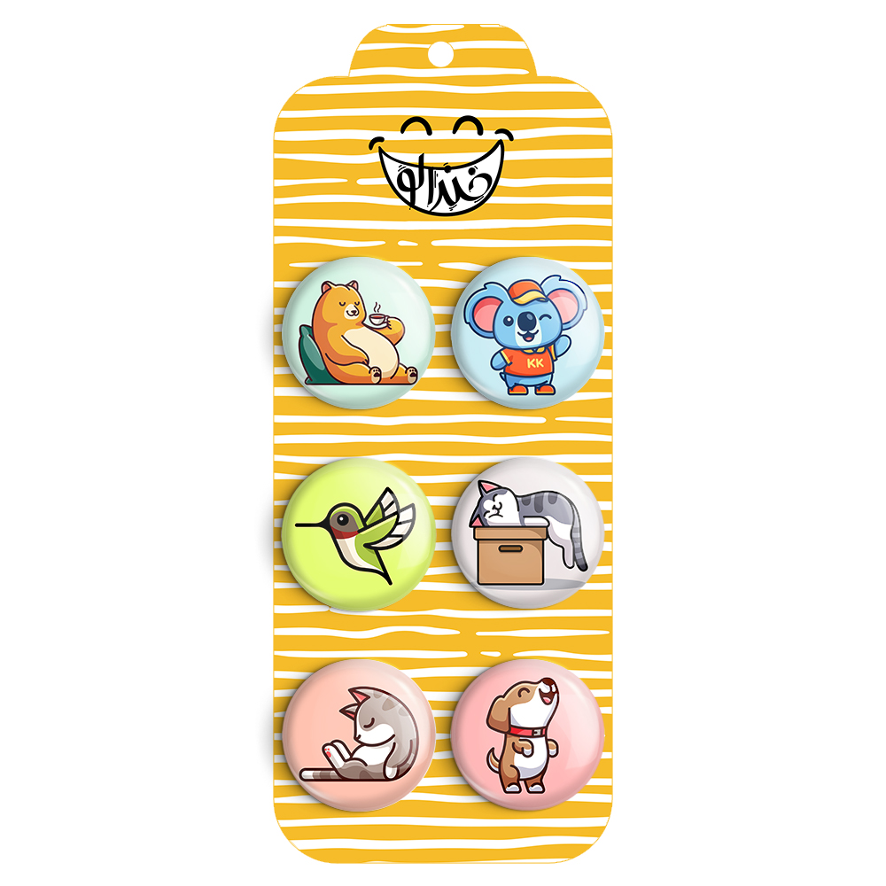 مجموعه 6 عددی پیکسل خندالو طرح حیوانات بامزه با روکش سلفون حرارتی براق ضدخش و قطعه پشتی رنگی تولید شده است. قطعات پشتی از میان 6 رنگ سفید، مشکی، صورتی، زرد، آبی و قرمز که با توجه به نوع و رنگبندی طرح روی پیکسل انتخاب شده اند تولید می شود و در هر بسته بندی مطابق عکس محصول می باشد.