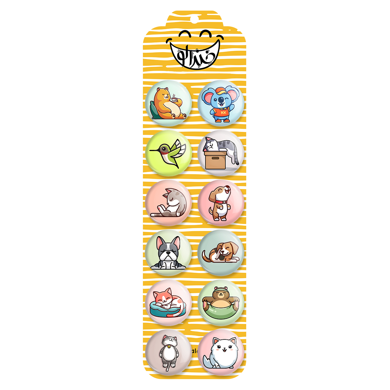 پک 12 عددی پیکسل خندالو طرح حیوانات بامزه با روکش سلفون حرارتی براق ضدخش و قطعه پشتی رنگی تولید شده است. قطعات پشتی از میان 6 رنگ سفید، مشکی، صورتی، زرد، آبی و قرمز که با توجه به نوع و رنگبندی طرح روی پیکسل انتخاب شده اند تولید می شود و در هر بسته بندی مطابق عکس محصول می باشد. قطعات پلاستیکی پشت پیکسل با سوزن یک تکه ثابت و بدون لغزش و جا به جایی، ایستایی بسیار بهتری نسبت به پشتی فلزی پیکسل دارند که این مهم در تولید این محصول نیز رعایت شده است.