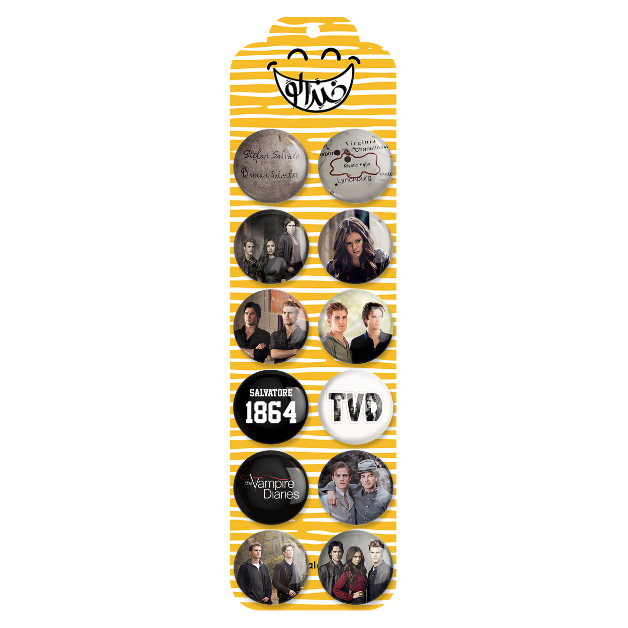 پک 12 عددی پیکسل خندالو طرح خاطرات خون آشام (The Vampire Diaries) با روکش سلفون حرارتی براق ضدخش و قطعه پشتی رنگی تولید شده است. قطعات پشتی از میان 6 رنگ سفید، مشکی، صورتی، زرد، آبی و قرمز که با توجه به نوع و رنگبندی طرح روی پیکسل انتخاب شده اند تولید می شود و در هر بسته بندی مطابق عکس محصول می باشد. قطعات پلاستیکی پشت پیکسل با سوزن یک تکه ثابت و بدون لغزش و جا به جایی، ایستایی بسیار بهتری نسبت به پشتی فلزی پیکسل دارند که این مهم در تولید این محصول نیز رعایت شده است. چاپ پیکسل طرح خاطرات خون آشام (The Vampire Diaries) بسته ۱۲ عددی نیز با دستگاه های استاندارد و با بهترین سطح کیفی صورت گرفته و طرح با شفافیتی مثال زدنی و با سلفونی بدون شکست نور بر روی پیکسل نقش بسته است.