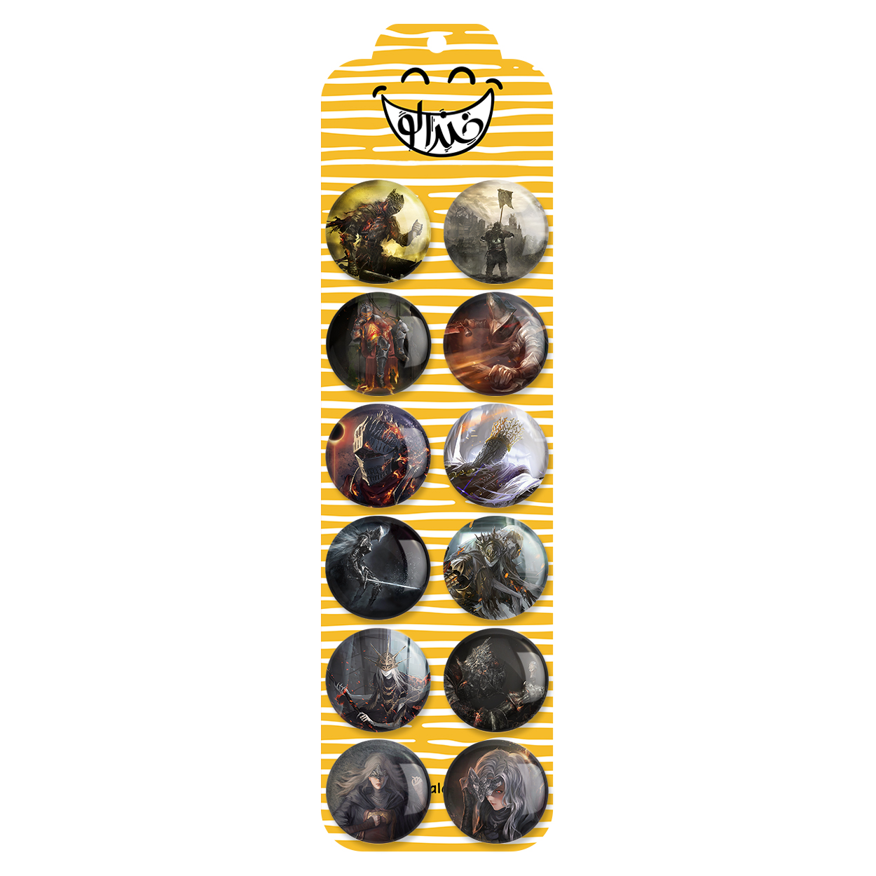 پک 12 عددی پیکسل خندالو طرح دارک سولز (Dark Souls) با روکش سلفون حرارتی براق ضدخش و قطعه پشتی رنگی تولید شده است. قطعات پشتی از میان 6 رنگ سفید، مشکی، صورتی، زرد، آبی و قرمز که با توجه به نوع و رنگبندی طرح روی پیکسل انتخاب شده اند تولید می شود و در هر بسته بندی مطابق عکس محصول می باشد. قطعات پلاستیکی پشت پیکسل با سوزن یک تکه ثابت و بدون لغزش و جا به جایی، ایستایی بسیار بهتری نسبت به پشتی فلزی پیکسل دارند که این مهم در تولید این محصول نیز رعایت شده است. چاپ پیکسل طرح دارک سولز (Dark Souls) بسته ۱۲ عددی نیز با دستگاه های استاندارد و با بهترین سطح کیفی صورت گرفته و طرح با شفافیتی مثال زدنی و با سلفونی بدون شکست نور بر روی پیکسل نقش بسته است.