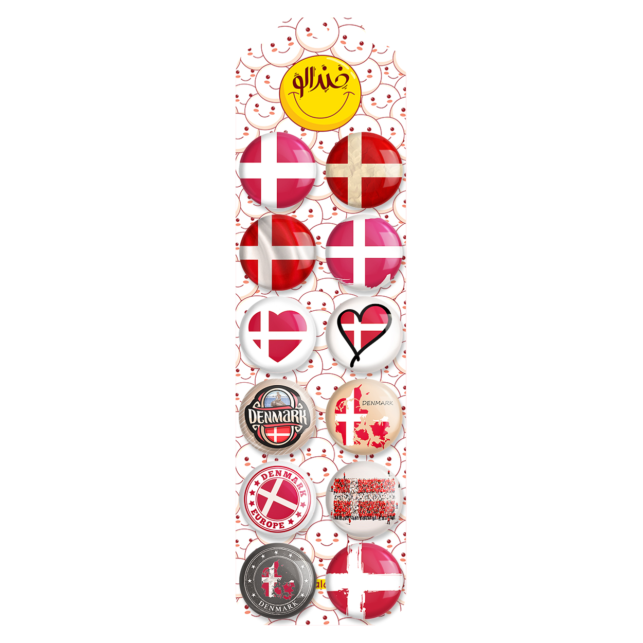 پک 12 عددی پیکسل خندالو طرح دانمارک (Denmark) با روکش سلفون حرارتی براق ضدخش و قطعه پشتی رنگی تولید شده است. قطعات پشتی از میان 6 رنگ سفید، مشکی، صورتی، زرد، آبی و قرمز که با توجه به نوع و رنگبندی طرح روی پیکسل انتخاب شده اند تولید می شود و در هر بسته بندی مطابق عکس محصول می باشد. قطعات پلاستیکی پشت پیکسل با سوزن یک تکه ثابت و بدون لغزش و جا به جایی، ایستایی بسیار بهتری نسبت به پشتی فلزی پیکسل دارند که این مهم در تولید این محصول نیز رعایت شده است. چاپ پیکسل طرح دانمارک (Denmark) بسته ۱۲ عددی نیز با دستگاه های استاندارد و با بهترین سطح کیفی صورت گرفته و طرح با شفافیتی مثال زدنی و با سلفونی بدون شکست نور بر روی پیکسل نقش بسته است.