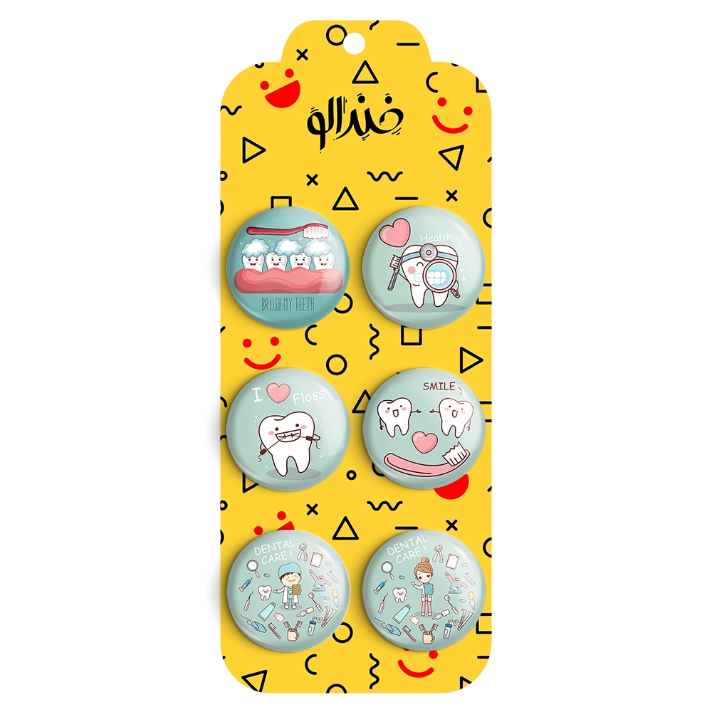 مجموعه 6 عددی پیکسل خندالو طرح دندان و دندان پزشکی کودکانه با روکش سلفون حرارتی براق ضدخش و قطعه پشتی رنگی تولید شده است. قطعات پشتی از میان 6 رنگ سفید، مشکی، صورتی، زرد، آبی و قرمز که با توجه به نوع و رنگبندی طرح روی پیکسل انتخاب شده اند تولید می شود و در هر بسته بندی مطابق عکس محصول می باشد. قطعات پلاستیکی پشت پیکسل با سوزن یک تکه ثابت و بدون لغزش و جا به جایی، ایستایی بسیار بهتری نسبت به پشتی فلزی پیکسل دارند که این مهم در تولید این محصول نیز رعایت شده است. چاپ پیکسل نیز با دستگاه های استاندارد و با بهترین سطح کیفی صورت گرفته و طرح با شفافیتی مثال زدنی و با سلفونی بدون شکست نور بر روی پیکسل نقش بسته است. همچنین بسته بندی جذاب و مینیمال پیکسل ها، آنها را مناسب هدیه کرده است..