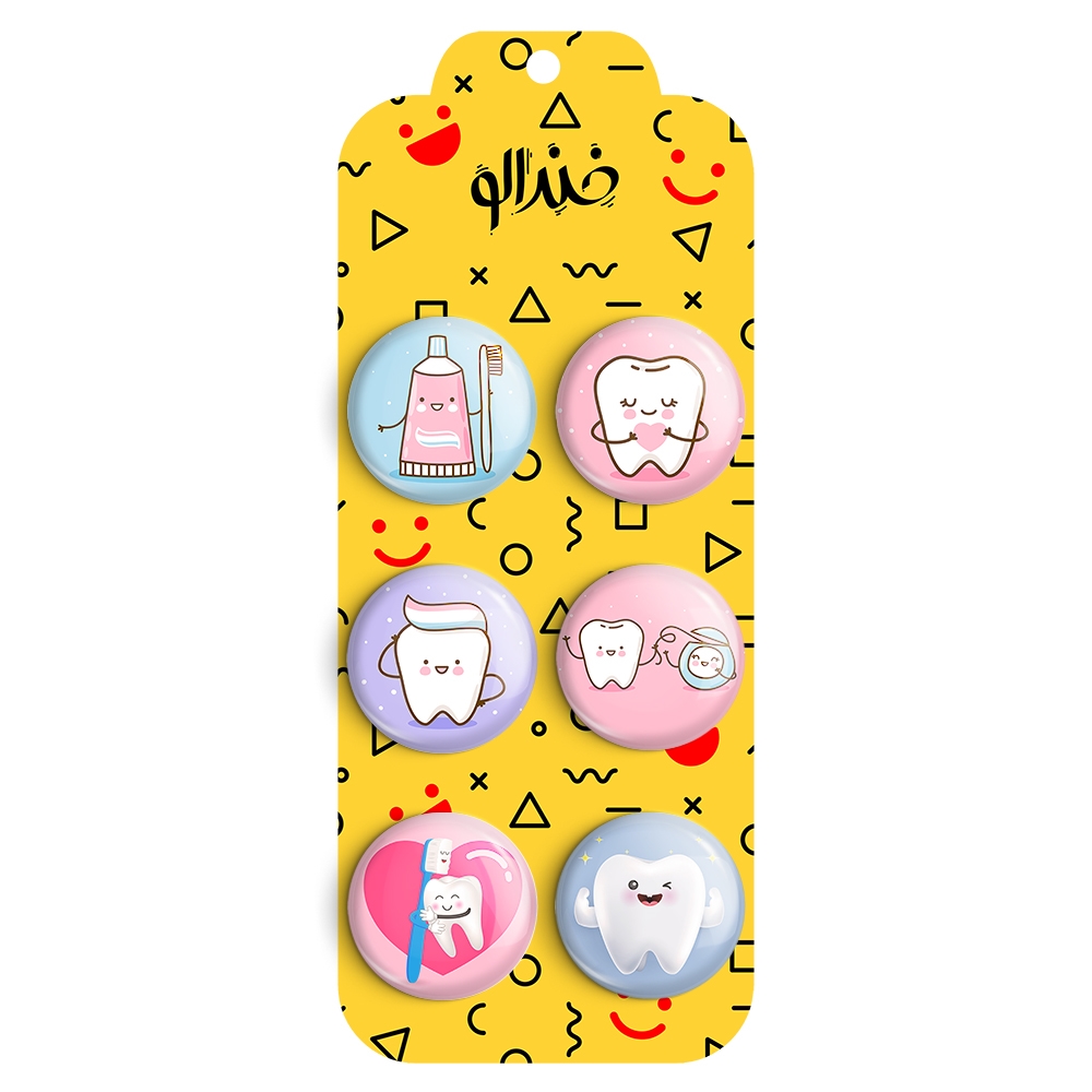 مجموعه 6 عددی پیکسل خندالو طرح دندان و دندان پزشکی کودکانه با روکش سلفون حرارتی براق ضدخش و قطعه پشتی رنگی تولید شده است. قطعات پشتی از میان 6 رنگ سفید، مشکی، صورتی، زرد، آبی و قرمز که با توجه به نوع و رنگبندی طرح روی پیکسل انتخاب شده اند تولید می شود و در هر بسته بندی مطابق عکس محصول می باشد. قطعات پلاستیکی پشت پیکسل با سوزن یک تکه ثابت و بدون لغزش و جا به جایی، ایستایی بسیار بهتری نسبت به پشتی فلزی پیکسل دارند که این مهم در تولید این محصول نیز رعایت شده است. چاپ پیکسل نیز با دستگاه های استاندارد و با بهترین سطح کیفی صورت گرفته و طرح با شفافیتی مثال زدنی و با سلفونی بدون شکست نور بر روی پیکسل نقش بسته است. همچنین بسته بندی جذاب و مینیمال پیکسل ها، آنها را مناسب هدیه کرده است..