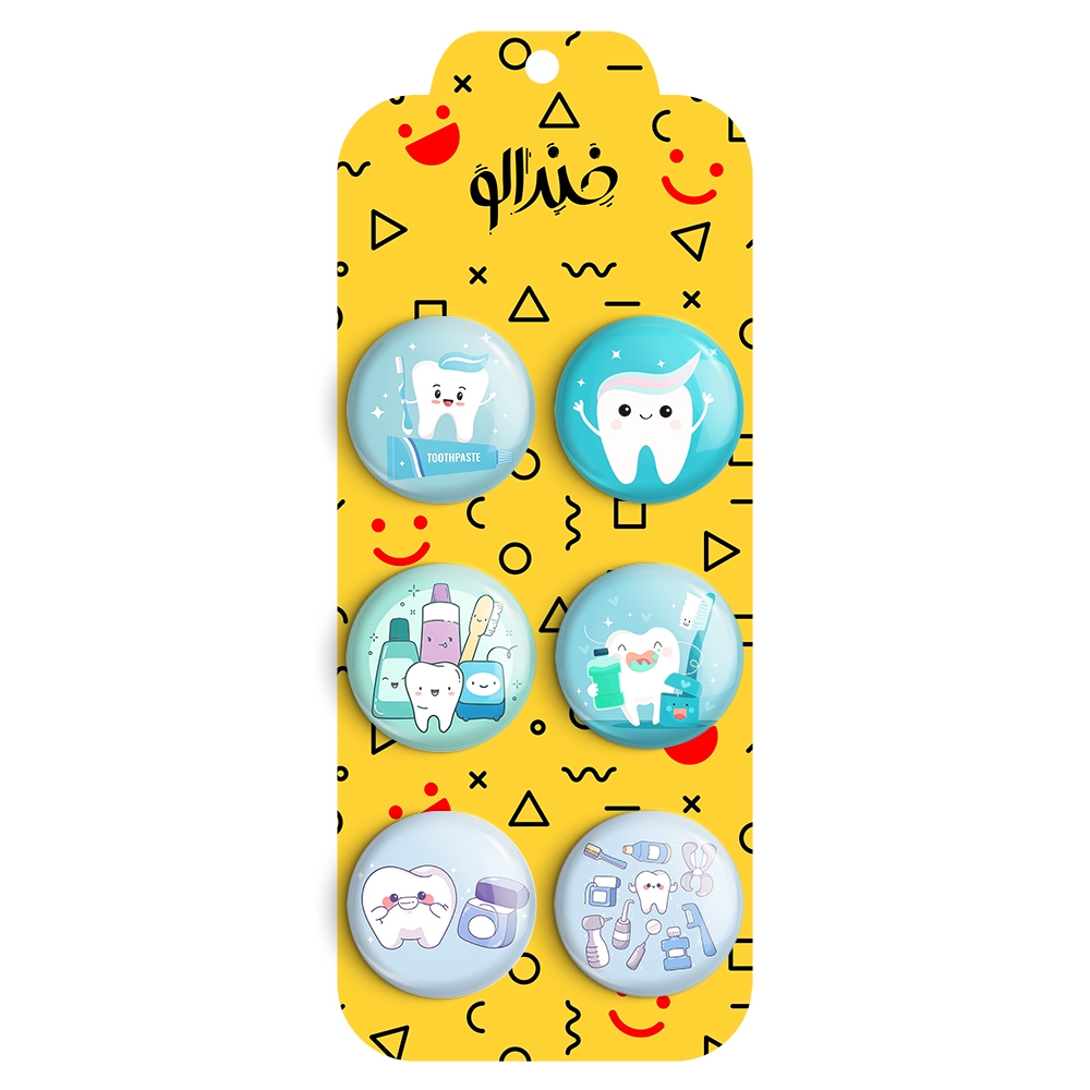 مجموعه 6 عددی پیکسل خندالو طرح دندان و دندان پزشکی کودکانه با روکش سلفون حرارتی براق ضدخش و قطعه پشتی رنگی تولید شده است. قطعات پشتی از میان 6 رنگ سفید، مشکی، صورتی، زرد، آبی و قرمز که با توجه به نوع و رنگبندی طرح روی پیکسل انتخاب شده اند تولید می شود و در هر بسته بندی مطابق عکس محصول می باشد.