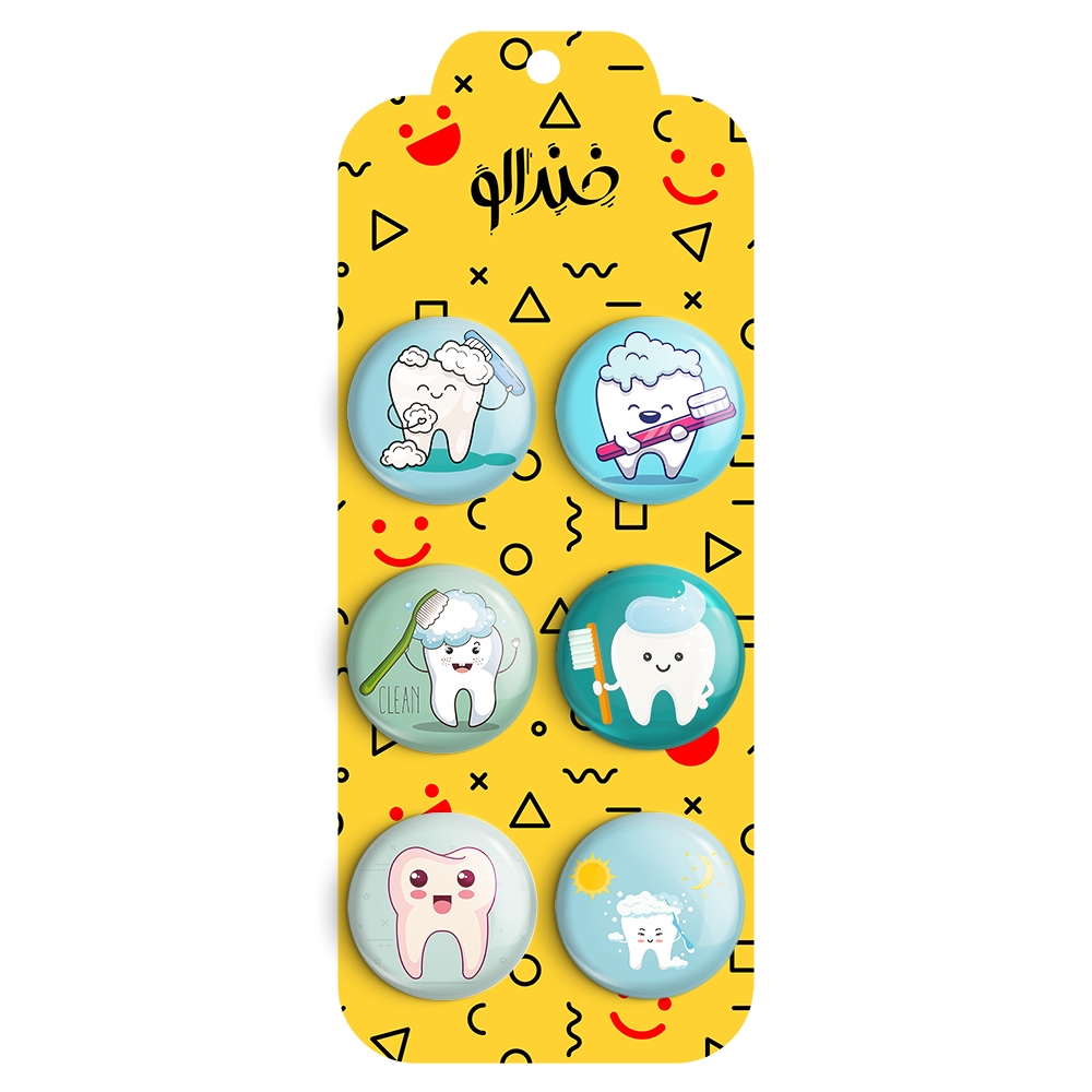 مجموعه 6 عددی پیکسل خندالو طرح دندان و دندان پزشکی کودکانه با روکش سلفون حرارتی براق ضدخش و قطعه پشتی رنگی تولید شده است. قطعات پشتی از میان 6 رنگ سفید، مشکی، صورتی، زرد، آبی و قرمز که با توجه به نوع و رنگبندی طرح روی پیکسل انتخاب شده اند تولید می شود و در هر بسته بندی مطابق عکس محصول می باشد.
