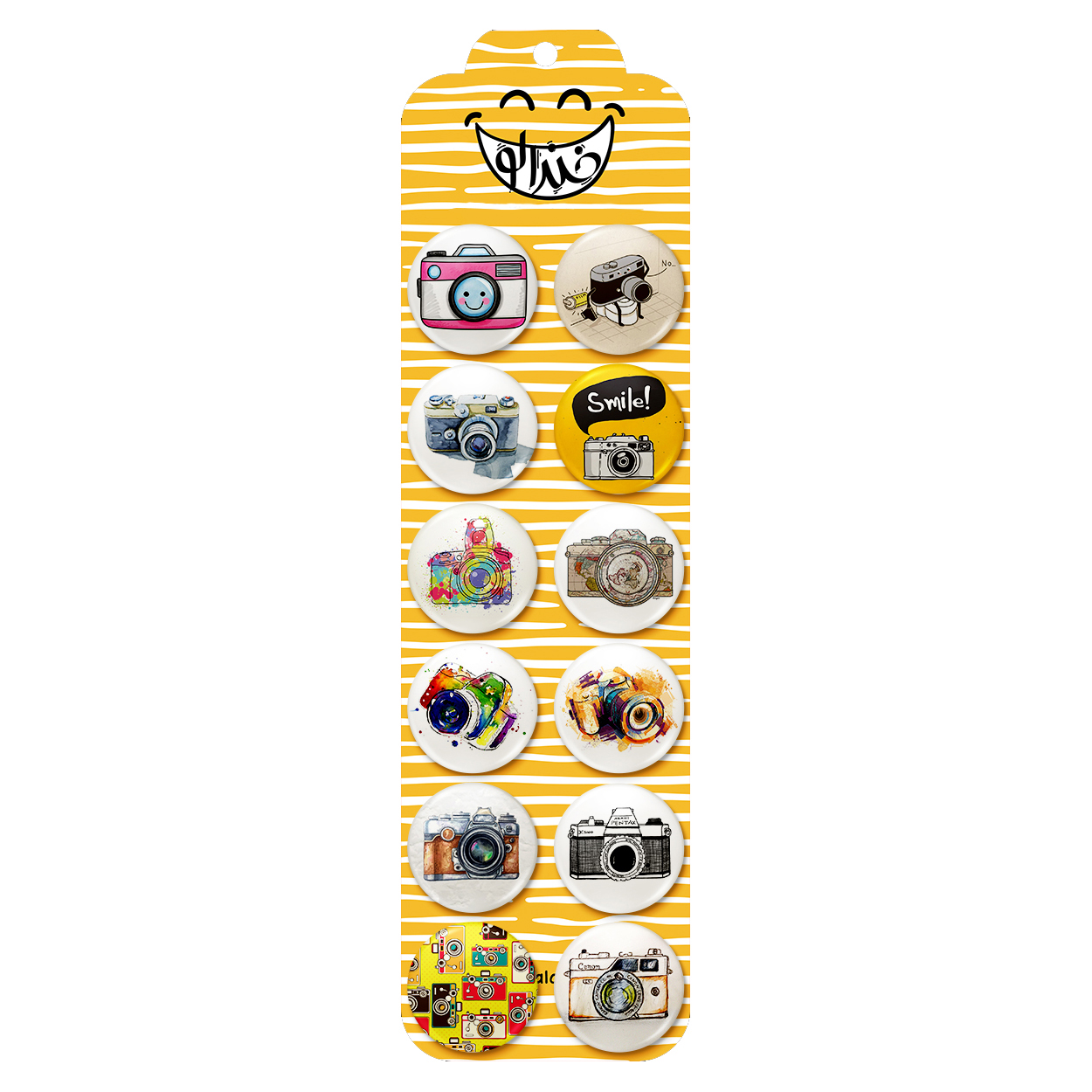 پک 12 عددی پیکسل خندالو طرح دوربین (Camera) با روکش سلفون حرارتی براق ضدخش و قطعه پشتی رنگی تولید شده است. قطعات پشتی از میان 6 رنگ سفید، مشکی، صورتی، زرد، آبی و قرمز که با توجه به نوع و رنگبندی طرح روی پیکسل انتخاب شده اند تولید می شود و در هر بسته بندی مطابق عکس محصول می باشد. قطعات پلاستیکی پشت پیکسل با سوزن یک تکه ثابت و بدون لغزش و جا به جایی، ایستایی بسیار بهتری نسبت به پشتی فلزی پیکسل دارند که این مهم در تولید این محصول نیز رعایت شده است. چاپ پیکسل طرح دوربین (Camera) بسته ۱۲ عددی نیز با دستگاه های استاندارد و با بهترین سطح کیفی صورت گرفته و طرح با شفافیتی مثال زدنی و با سلفونی بدون شکست نور بر روی پیکسل نقش بسته است.