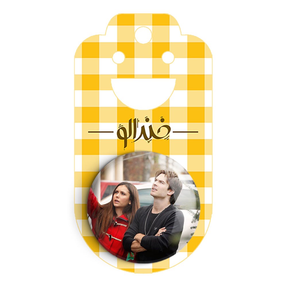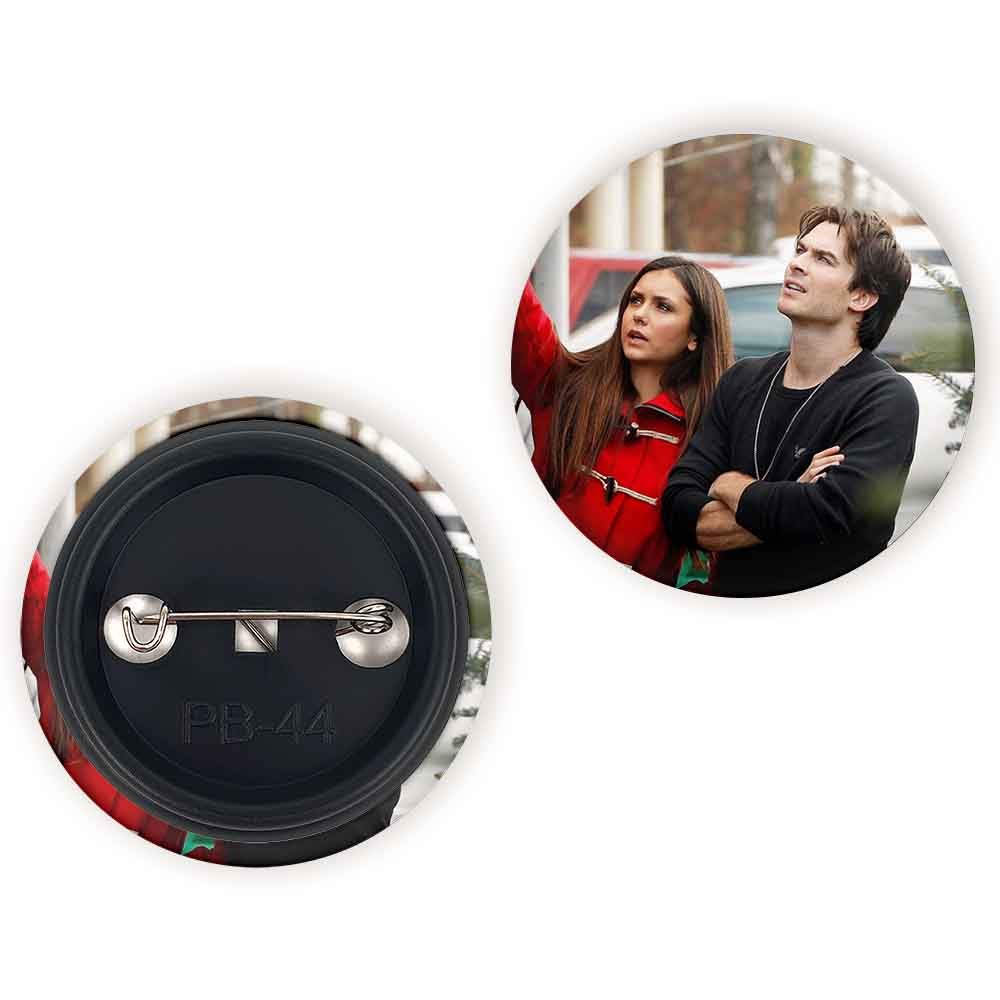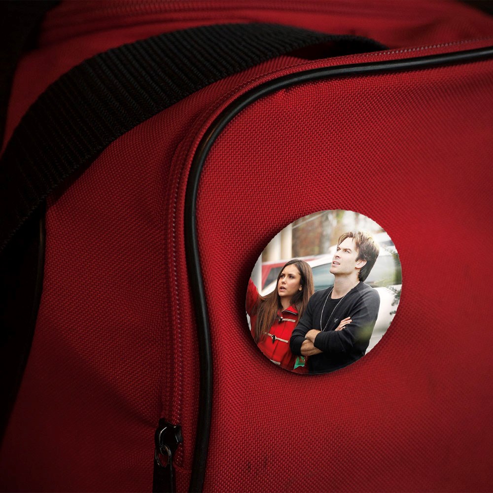 پیکسل 44 میلی متری دیمون و الینا خاطرات یک خون آشام The Vampire Diaries خندالو با روکش سلفون حرارتی مات مخملی ضدخش و قطعه پشتی رنگی تولید شده است.پلاستیکی پشت پیکسل با سوزن یک تکه ثابت و بدون لغزش و جا به جایی، ایستایی بسیار بهتری نسبت به پشتی فلزی پیکسل دارند که این مهم در تولید این محصول نیز رعایت شده است.