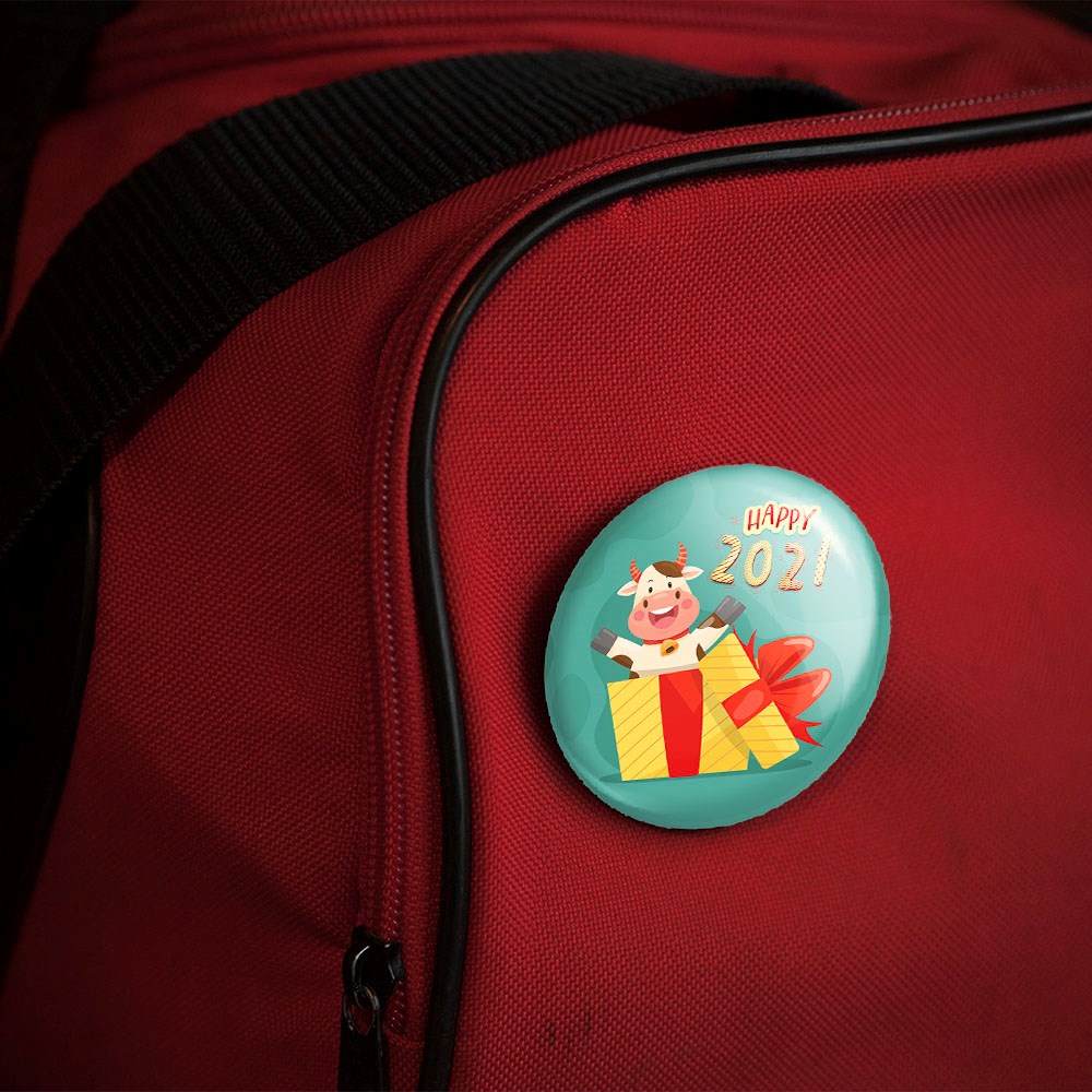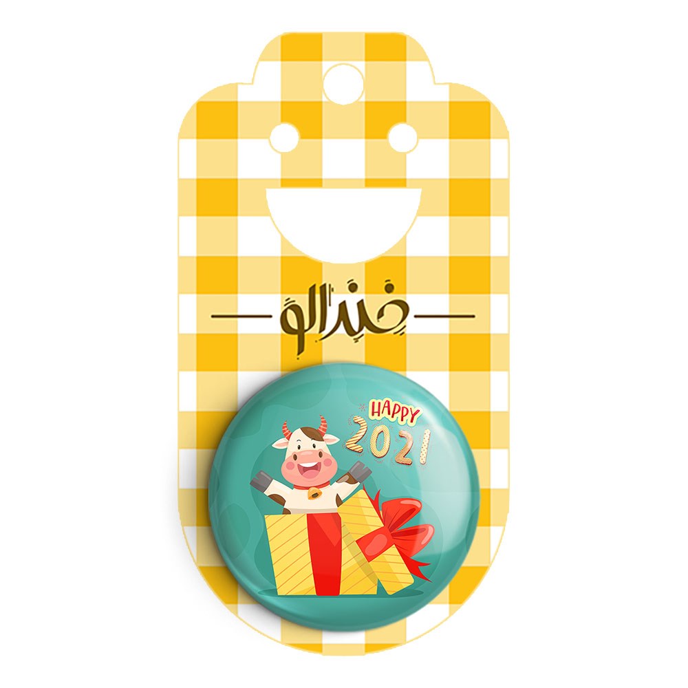 پیکسل 44 میلی متری سال گاو خندالو با روکش سلفون حرارتی مات مخملی ضدخش و قطعه پشتی رنگی تولید شده است.پلاستیکی پشت پیکسل با سوزن یک تکه ثابت و بدون لغزش و جا به جایی، ایستایی بسیار بهتری نسبت به پشتی فلزی پیکسل دارند که این مهم در تولید این محصول نیز رعایت شده است.