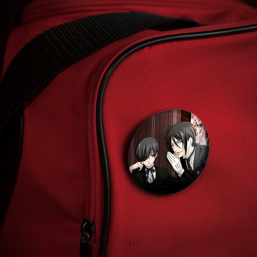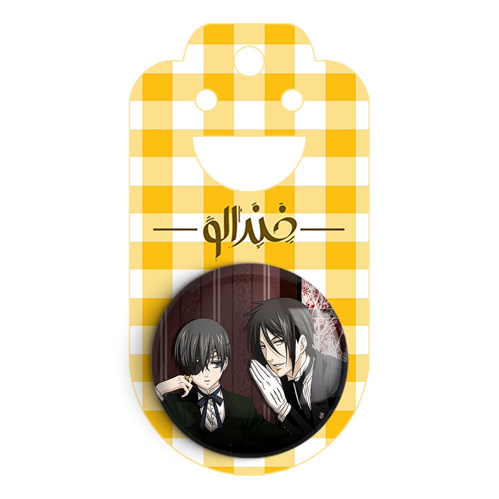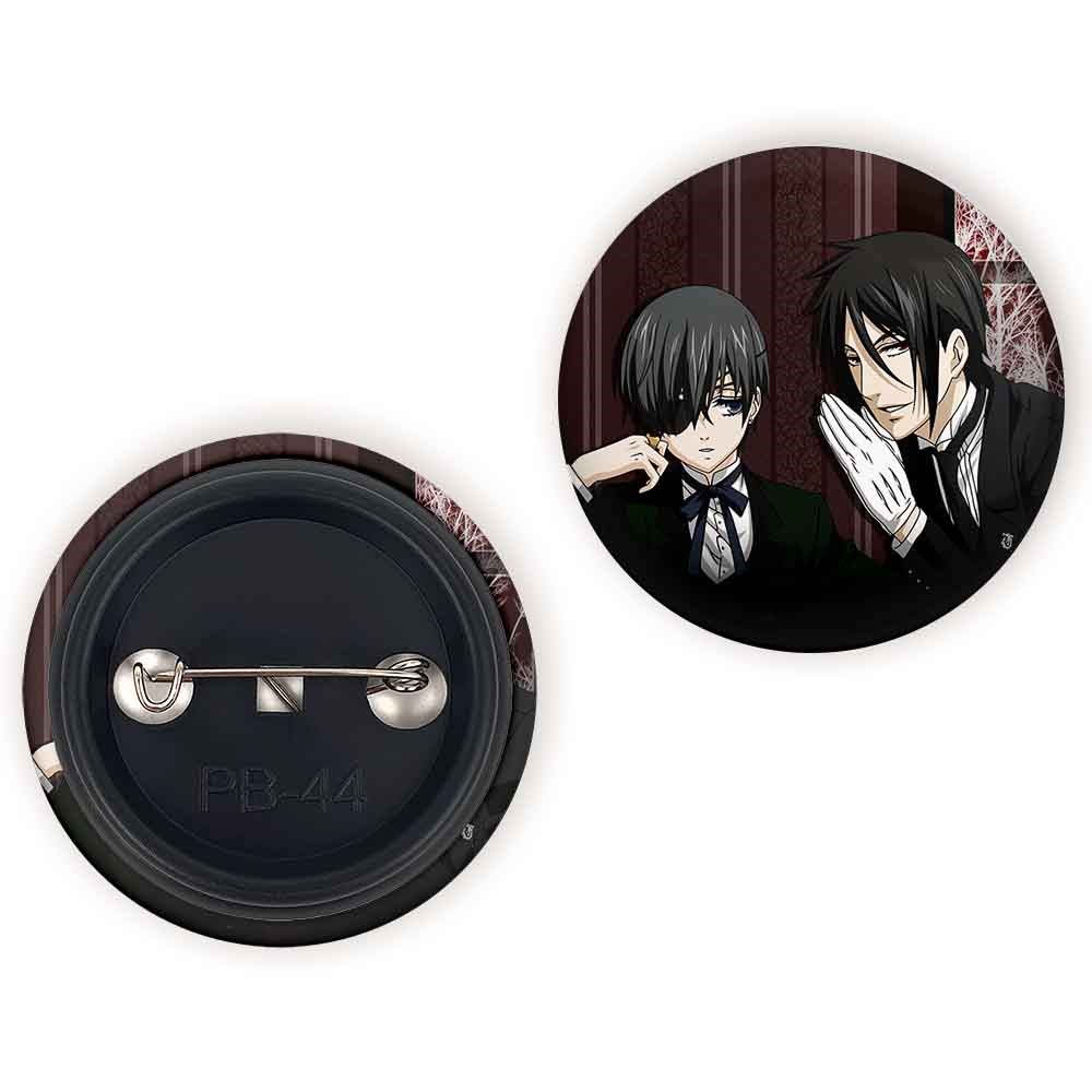 پیکسل 44 میلی متری سباستین و شیل انیمه خادم سیاه Black Butler خندالو با روکش سلفون حرارتی مات مخملی ضدخش و قطعه پشتی رنگی تولید شده است.پلاستیکی پشت پیکسل با سوزن یک تکه ثابت و بدون لغزش و جا به جایی، ایستایی بسیار بهتری نسبت به پشتی فلزی پیکسل دارند که این مهم در تولید این محصول نیز رعایت شده است.