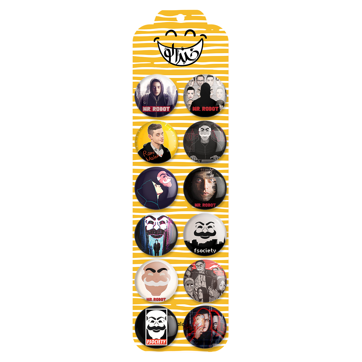 پک 12 عددی پیکسل خندالو طرح سریال آقای ربات (Mr.robot) با روکش سلفون حرارتی براق ضدخش و قطعه پشتی رنگی تولید شده است. قطعات پشتی از میان 6 رنگ سفید، مشکی، صورتی، زرد، آبی و قرمز که با توجه به نوع و رنگبندی طرح روی پیکسل انتخاب شده اند تولید می شود و در هر بسته بندی مطابق عکس محصول می باشد. قطعات پلاستیکی پشت پیکسل با سوزن یک تکه ثابت و بدون لغزش و جا به جایی، ایستایی بسیار بهتری نسبت به پشتی فلزی پیکسل دارند که این مهم در تولید این محصول نیز رعایت شده است. چاپ پیکسل طرح سریال آقای ربات (Mr.robot) بسته ۱۲ عددی نیز با دستگاه های استاندارد و با بهترین سطح کیفی صورت گرفته و طرح با شفافیتی مثال زدنی و با سلفونی بدون شکست نور بر روی پیکسل نقش بسته است.