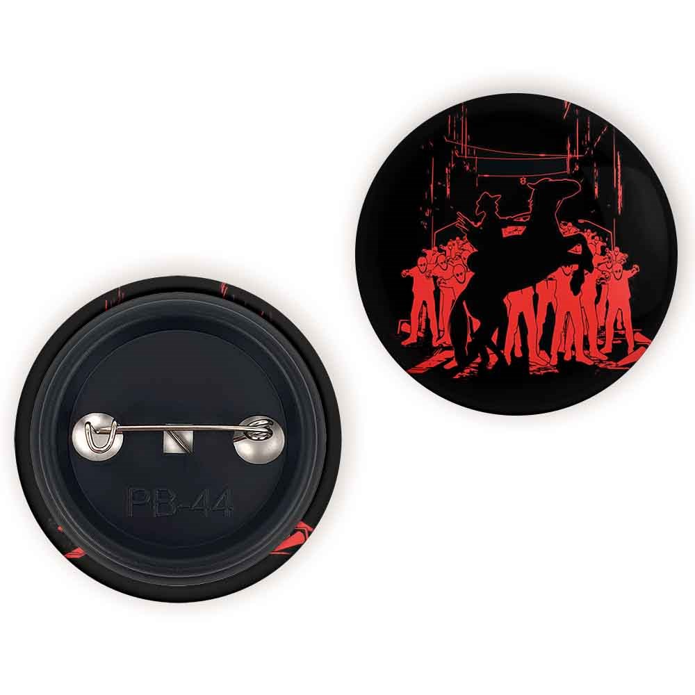 پیکسل 44 میلی متری سریال مردگان متحرک The Walking Dead خندالو با روکش سلفون حرارتی مات مخملی ضدخش و قطعه پشتی رنگی تولید شده است.پلاستیکی پشت پیکسل با سوزن یک تکه ثابت و بدون لغزش و جا به جایی، ایستایی بسیار بهتری نسبت به پشتی فلزی پیکسل دارند که این مهم در تولید این محصول نیز رعایت شده است.