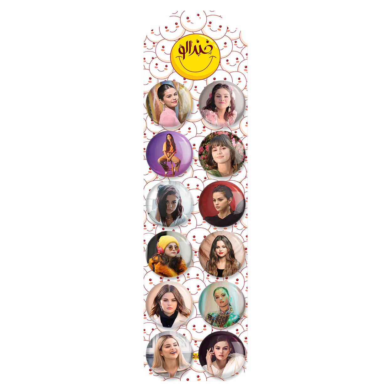 پک 12 عددی پیکسل خندالو طرح سلنا گومز (Selena Gomez) با روکش سلفون حرارتی براق ضدخش و قطعه پشتی رنگی تولید شده است. قطعات پشتی از میان 6 رنگ سفید، مشکی، صورتی، زرد، آبی و قرمز که با توجه به نوع و رنگبندی طرح روی پیکسل انتخاب شده اند تولید می شود و در هر بسته بندی مطابق عکس محصول می باشد. قطعات پلاستیکی پشت پیکسل با سوزن یک تکه ثابت و بدون لغزش و جا به جایی، ایستایی بسیار بهتری نسبت به پشتی فلزی پیکسل دارند که این مهم در تولید این محصول نیز رعایت شده است.