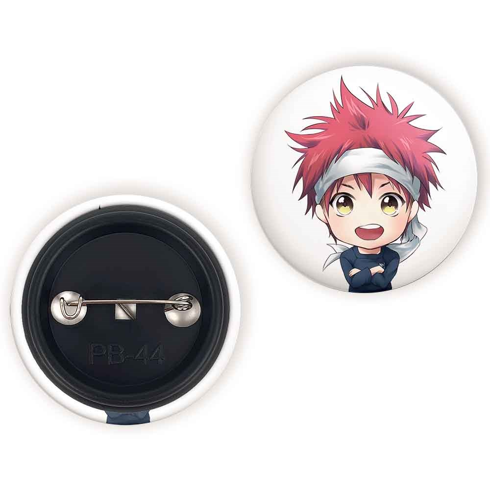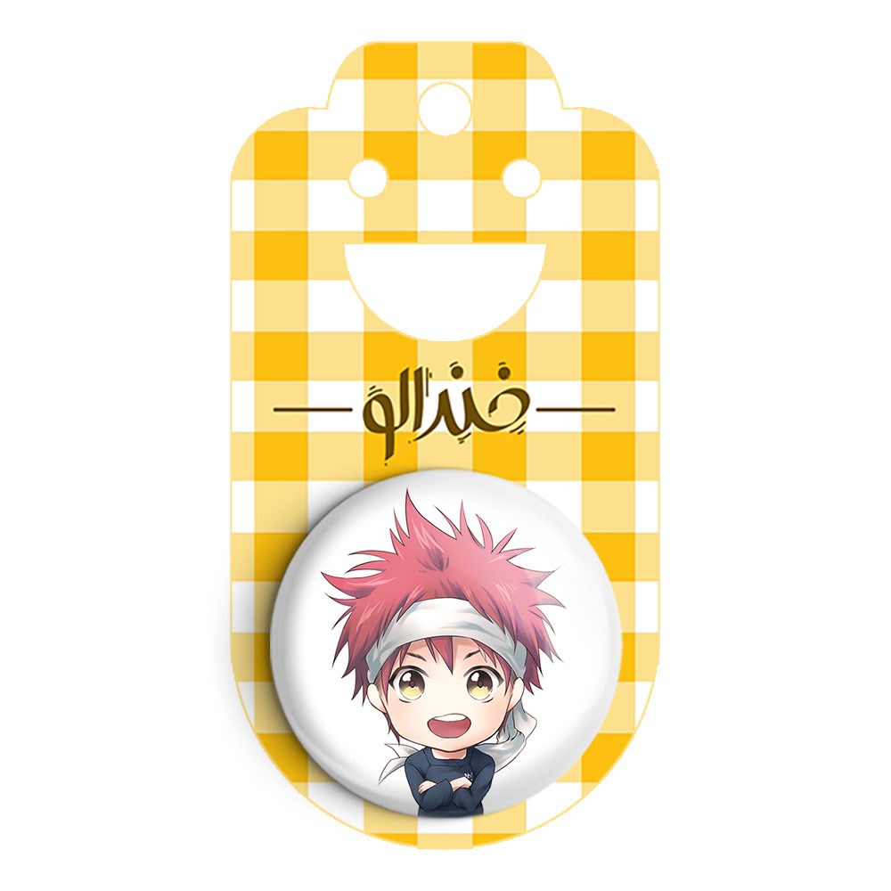 پیکسل 44 میلی متری سوما انیمه جنگ غذاها Food Wars خندالو با روکش سلفون حرارتی مات مخملی ضدخش و قطعه پشتی رنگی تولید شده است.پلاستیکی پشت پیکسل با سوزن یک تکه ثابت و بدون لغزش و جا به جایی، ایستایی بسیار بهتری نسبت به پشتی فلزی پیکسل دارند که این مهم در تولید این محصول نیز رعایت شده است.