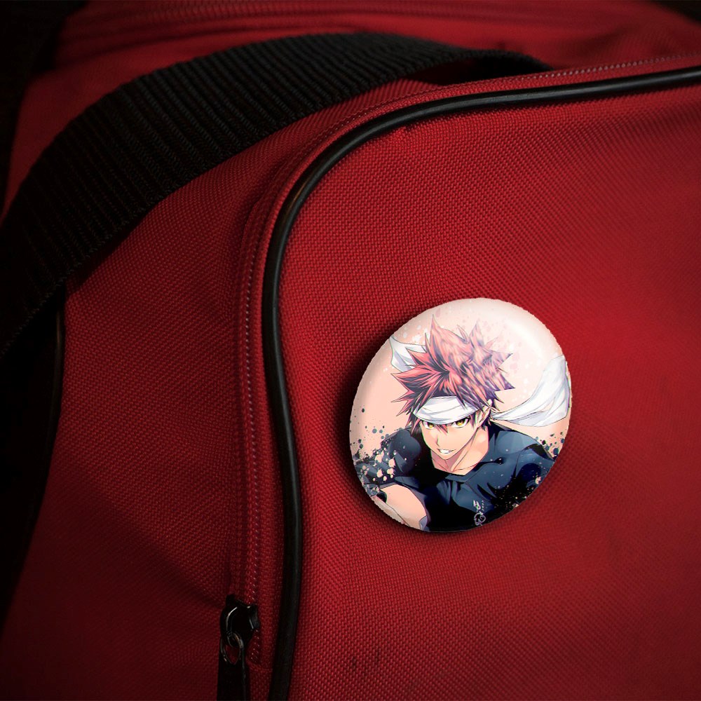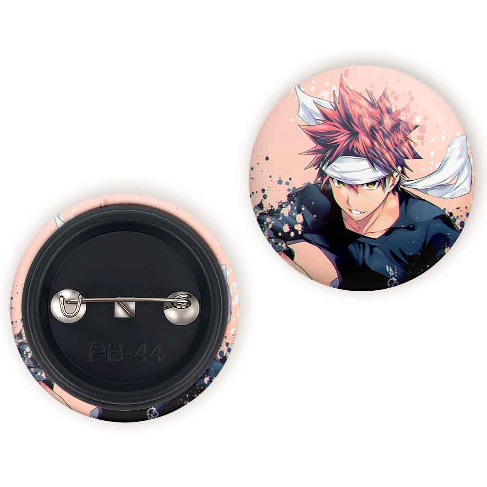 پیکسل 44 میلی متری سوما انیمه جنگ غذاها Food Wars خندالو با روکش سلفون حرارتی مات مخملی ضدخش و قطعه پشتی رنگی تولید شده است.پلاستیکی پشت پیکسل با سوزن یک تکه ثابت و بدون لغزش و جا به جایی، ایستایی بسیار بهتری نسبت به پشتی فلزی پیکسل دارند که این مهم در تولید این محصول نیز رعایت شده است.