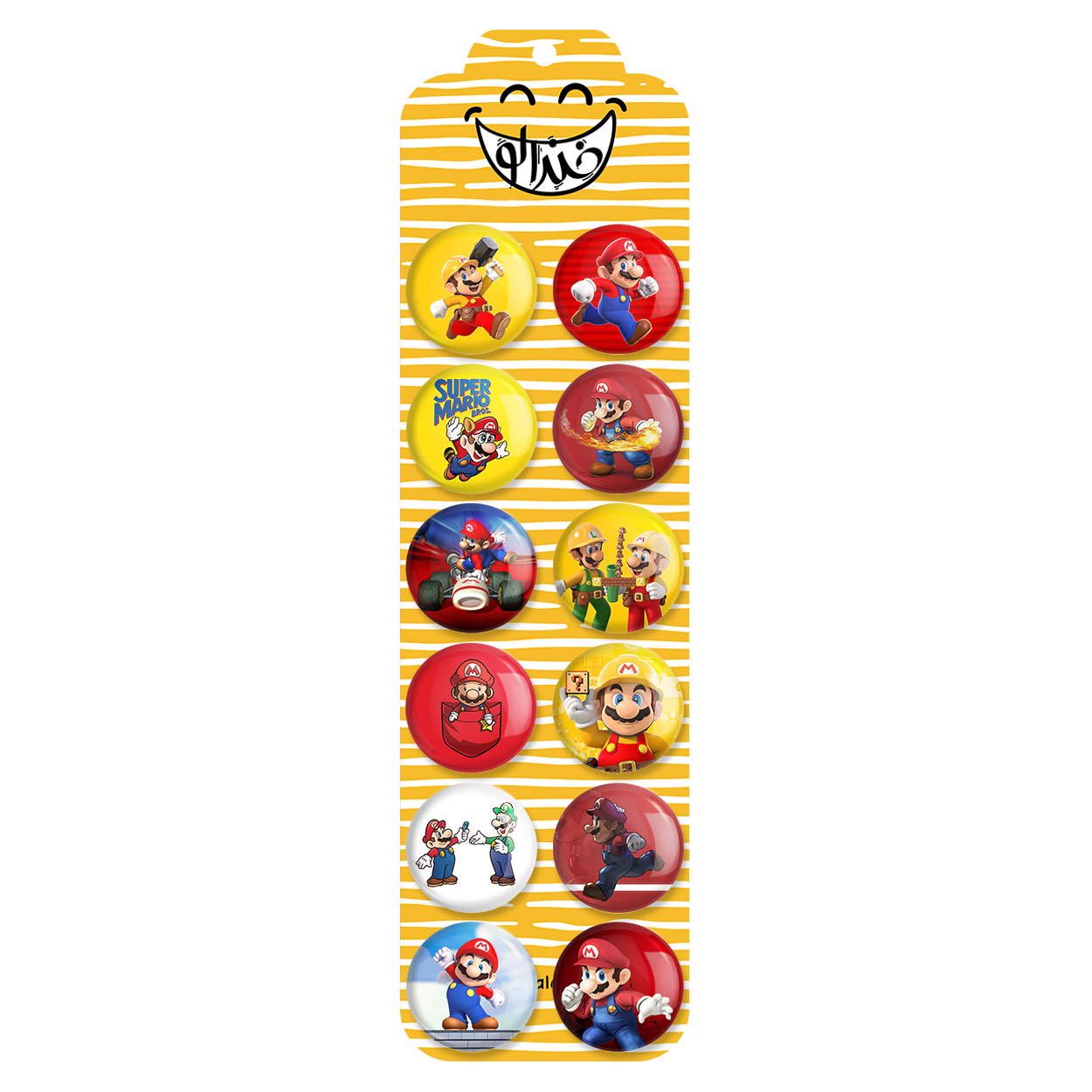 پک 12 عددی پیکسل خندالو طرح سوپرماریو (Super Mario) با روکش سلفون حرارتی براق ضدخش و قطعه پشتی رنگی تولید شده است. قطعات پشتی از میان 6 رنگ سفید، مشکی، صورتی، زرد، آبی و قرمز که با توجه به نوع و رنگبندی طرح روی پیکسل انتخاب شده اند تولید می شود و در هر بسته بندی مطابق عکس محصول می باشد. قطعات پلاستیکی پشت پیکسل با سوزن یک تکه ثابت و بدون لغزش و جا به جایی، ایستایی بسیار بهتری نسبت به پشتی فلزی پیکسل دارند که این مهم در تولید این محصول نیز رعایت شده است.