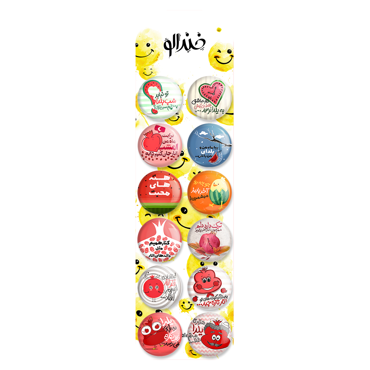 پک 12 عددی پیکسل خندالو طرح شب یلدا با روکش سلفون حرارتی براق ضدخش و قطعه پشتی رنگی تولید شده است. قطعات پشتی از میان 6 رنگ سفید، مشکی، صورتی، زرد، آبی و قرمز که با توجه به نوع و رنگبندی طرح روی پیکسل انتخاب شده اند تولید می شود و در هر بسته بندی مطابق عکس محصول می باشد. قطعات پلاستیکی پشت پیکسل با سوزن یک تکه ثابت و بدون لغزش و جا به جایی، ایستایی بسیار بهتری نسبت به پشتی فلزی پیکسل دارند که این مهم در تولید این محصول نیز رعایت شده است.