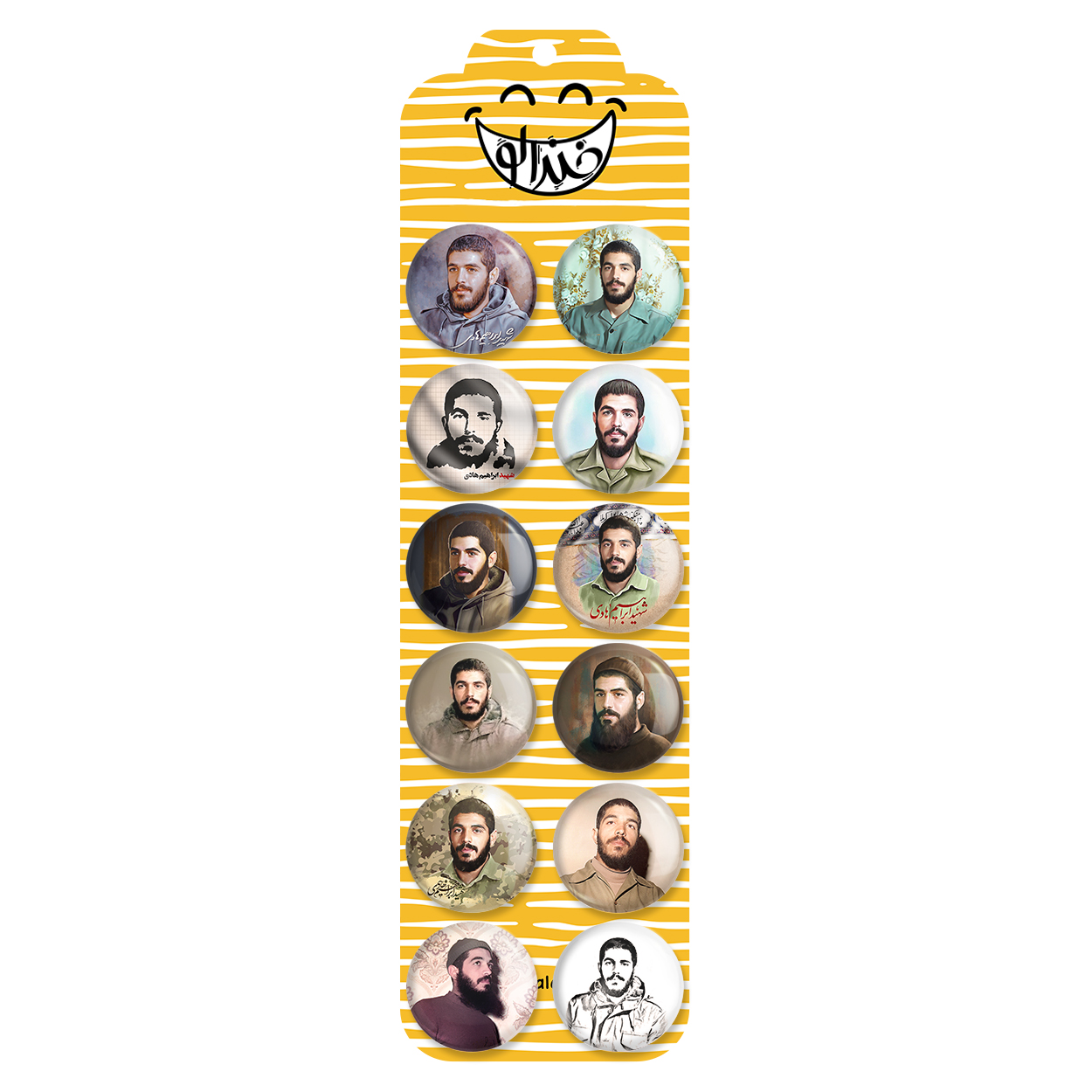 پک 12 عددی پیکسل خندالو طرح شهید ابراهیم هادی با روکش سلفون حرارتی براق ضدخش و قطعه پشتی رنگی تولید شده است. قطعات پشتی از میان 6 رنگ سفید، مشکی، صورتی، زرد، آبی و قرمز که با توجه به نوع و رنگبندی طرح روی پیکسل انتخاب شده اند تولید می شود و در هر بسته بندی مطابق عکس محصول می باشد. قطعات پلاستیکی پشت پیکسل با سوزن یک تکه ثابت و بدون لغزش و جا به جایی، ایستایی بسیار بهتری نسبت به پشتی فلزی پیکسل دارند که این مهم در تولید این محصول نیز رعایت شده است. چاپ پیکسل طرح شهید ابراهیم هادی بسته ۱۲ عددی نیز با دستگاه های استاندارد و با بهترین سطح کیفی صورت گرفته و طرح با شفافیتی مثال زدنی و با سلفونی بدون شکست نور بر روی پیکسل نقش بسته است.