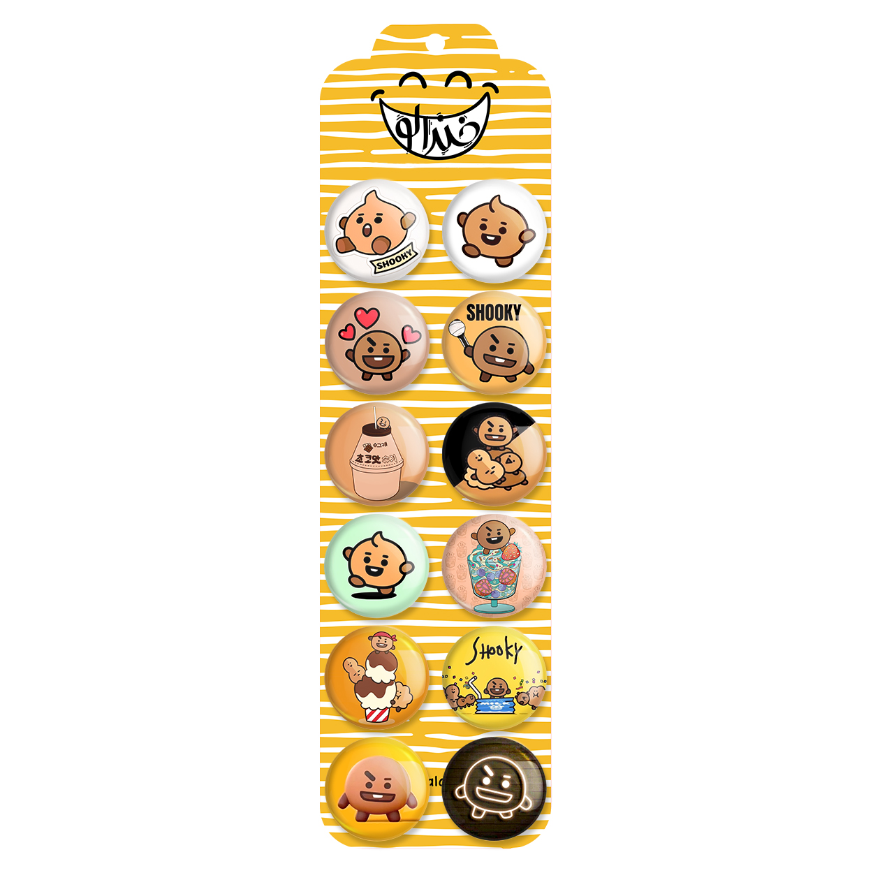 پک 12 عددی پیکسل خندالو طرح شوکی BT21 Shooky با روکش سلفون حرارتی براق ضدخش و قطعه پشتی رنگی تولید شده است. قطعات پشتی از میان 6 رنگ سفید، مشکی، صورتی، زرد، آبی و قرمز که با توجه به نوع و رنگبندی طرح روی پیکسل انتخاب شده اند تولید می شود و در هر بسته بندی مطابق عکس محصول می باشد. قطعات پلاستیکی پشت پیکسل با سوزن یک تکه ثابت و بدون لغزش و جا به جایی، ایستایی بسیار بهتری نسبت به پشتی فلزی پیکسل دارند که این مهم در تولید این محصول نیز رعایت شده است. چاپ پیکسل طرح شوکی BT21 Shooky بسته ۱۲ عددی نیز با دستگاه های استاندارد و با بهترین سطح کیفی صورت گرفته و طرح با شفافیتی مثال زدنی و با سلفونی بدون شکست نور بر روی پیکسل نقش بسته است.