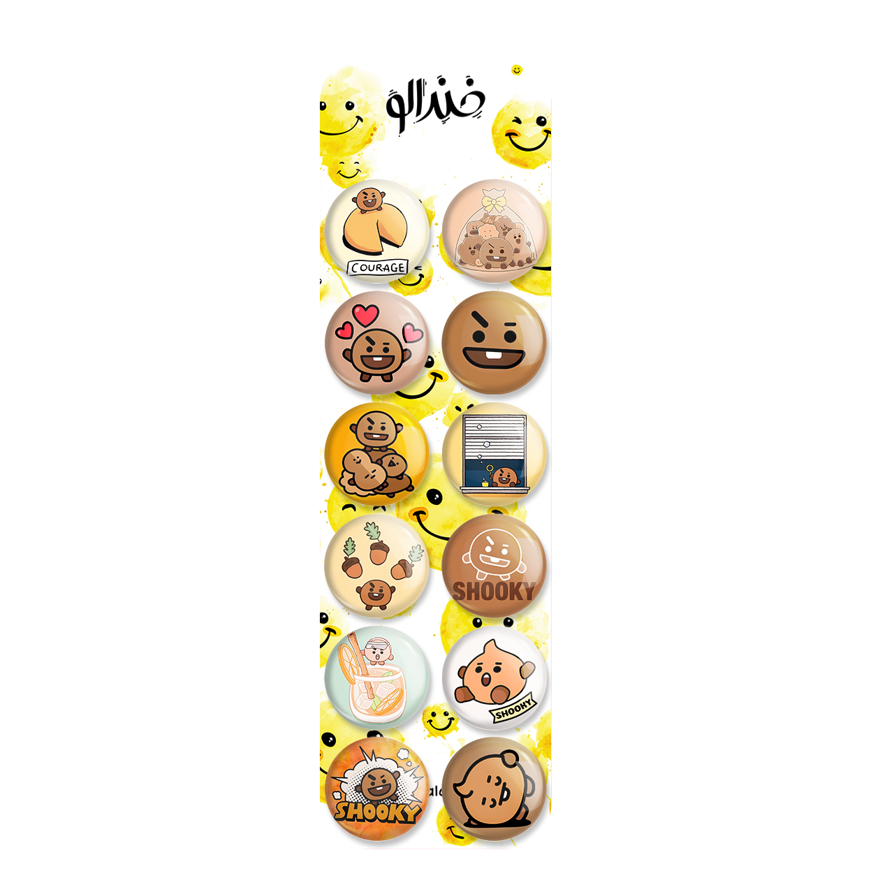 پک 12 عددی پیکسل خندالو طرح شوکی BT21 Shooky با روکش سلفون حرارتی براق ضدخش و قطعه پشتی رنگی تولید شده است. قطعات پشتی از میان 6 رنگ سفید، مشکی، صورتی، زرد، آبی و قرمز که با توجه به نوع و رنگبندی طرح روی پیکسل انتخاب شده اند تولید می شود و در هر بسته بندی مطابق عکس محصول می باشد. قطعات پلاستیکی پشت پیکسل با سوزن یک تکه ثابت و بدون لغزش و جا به جایی، ایستایی بسیار بهتری نسبت به پشتی فلزی پیکسل دارند که این مهم در تولید این محصول نیز رعایت شده است. چاپ پیکسل طرح شوکی BT21 Shooky بسته ۱۲ عددی نیز با دستگاه های استاندارد و با بهترین سطح کیفی صورت گرفته و طرح با شفافیتی مثال زدنی و با سلفونی بدون شکست نور بر روی پیکسل نقش بسته است.