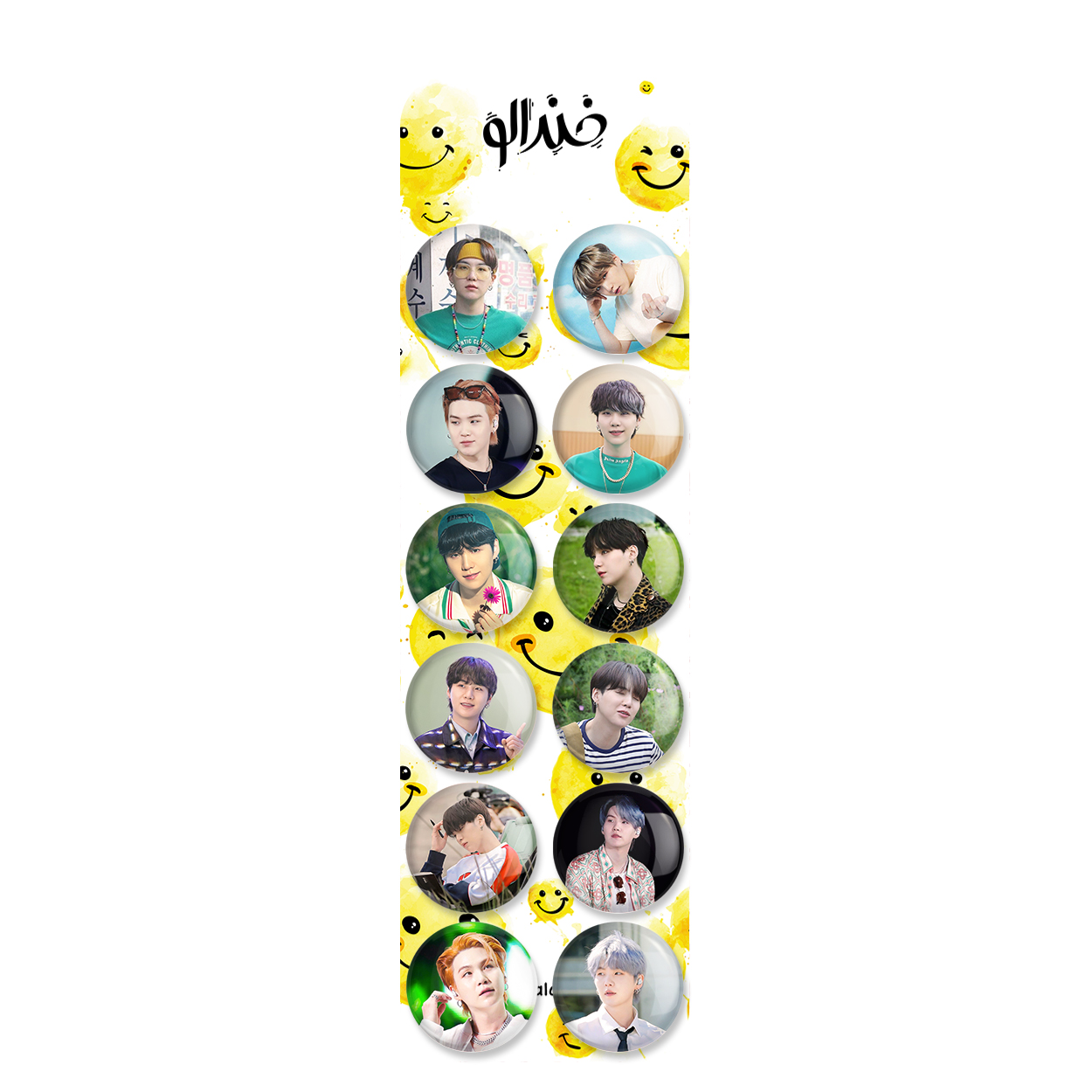 پک 12 عددی پیکسل خندالو طرح شوگا (Suga) بی تی اس BTS با روکش سلفون حرارتی براق ضدخش و قطعه پشتی رنگی تولید شده است. قطعات پشتی از میان 6 رنگ سفید، مشکی، صورتی، زرد، آبی و قرمز که با توجه به نوع و رنگبندی طرح روی پیکسل انتخاب شده اند تولید می شود و در هر بسته بندی مطابق عکس محصول می باشد. قطعات پلاستیکی پشت پیکسل با سوزن یک تکه ثابت و بدون لغزش و جا به جایی، ایستایی بسیار بهتری نسبت به پشتی فلزی پیکسل دارند که این مهم در تولید این محصول نیز رعایت شده است.
