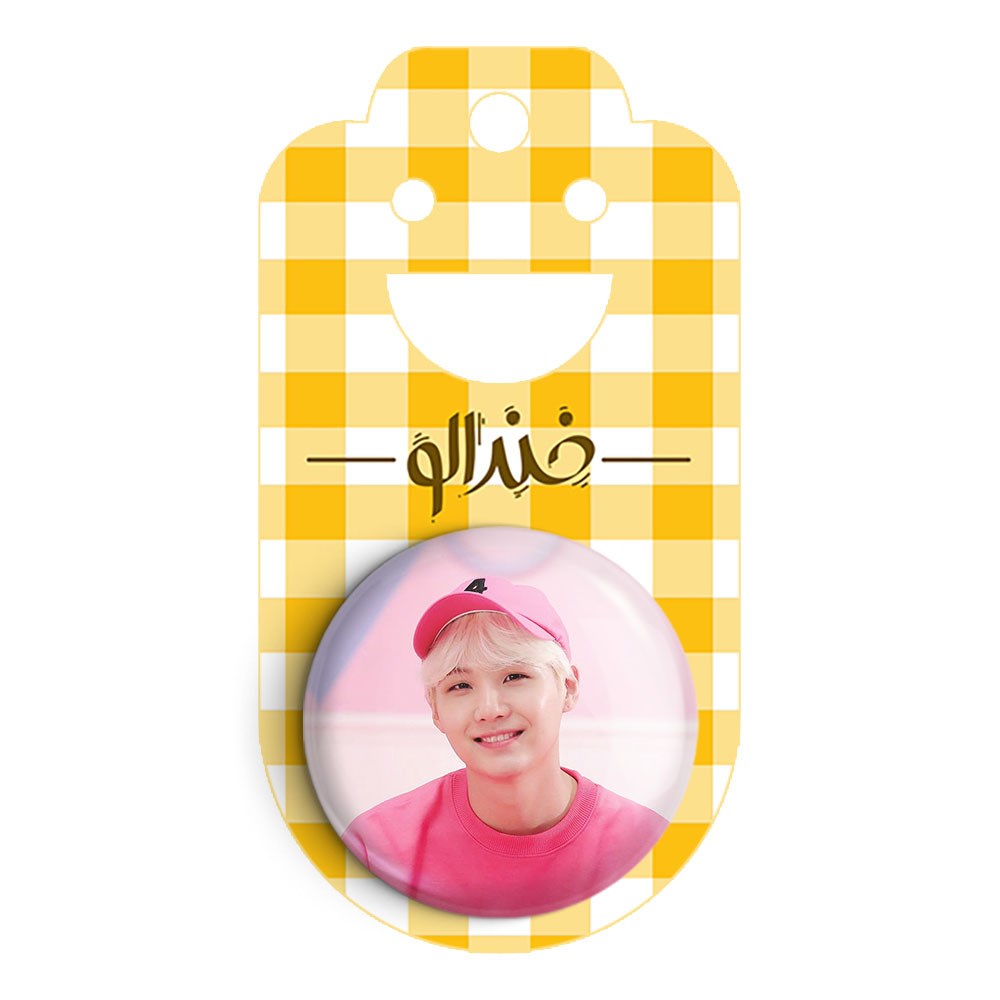 پیکسل 44 میلی متری شوگا Suga گروه بی تی اس BTS خندالو با روکش سلفون حرارتی مات مخملی ضدخش و قطعه پشتی رنگی تولید شده است.پلاستیکی پشت پیکسل با سوزن یک تکه ثابت و بدون لغزش و جا به جایی، ایستایی بسیار بهتری نسبت به پشتی فلزی پیکسل دارند که این مهم در تولید این محصول نیز رعایت شده است.