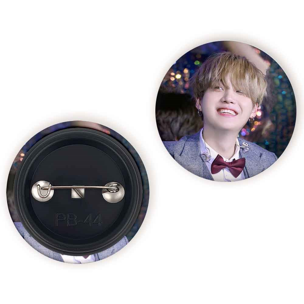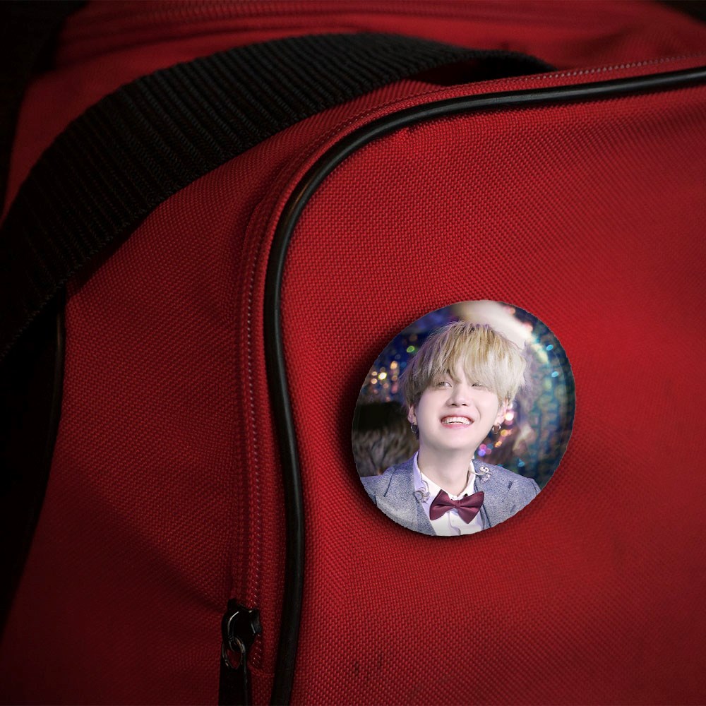 پیکسل 44 میلی متری شوگا Suga گروه بی تی اس BTS خندالو با روکش سلفون حرارتی مات مخملی ضدخش و قطعه پشتی رنگی تولید شده است.پلاستیکی پشت پیکسل با سوزن یک تکه ثابت و بدون لغزش و جا به جایی، ایستایی بسیار بهتری نسبت به پشتی فلزی پیکسل دارند که این مهم در تولید این محصول نیز رعایت شده است.
