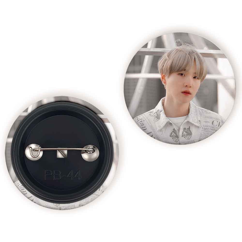 پیکسل 44 میلی متری شوگا Suga گروه بی تی اس BTS خندالو با روکش سلفون حرارتی مات مخملی ضدخش و قطعه پشتی رنگی تولید شده است.پلاستیکی پشت پیکسل با سوزن یک تکه ثابت و بدون لغزش و جا به جایی، ایستایی بسیار بهتری نسبت به پشتی فلزی پیکسل دارند که این مهم در تولید این محصول نیز رعایت شده است.