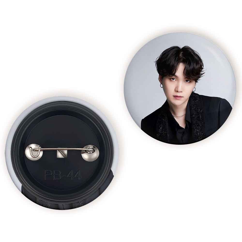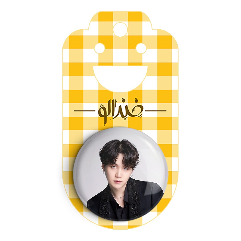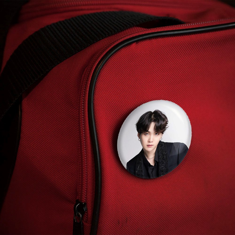 پیکسل 44 میلی متری شوگا Suga گروه بی تی اس BTS خندالو با روکش سلفون حرارتی مات مخملی ضدخش و قطعه پشتی رنگی تولید شده است.پلاستیکی پشت پیکسل با سوزن یک تکه ثابت و بدون لغزش و جا به جایی، ایستایی بسیار بهتری نسبت به پشتی فلزی پیکسل دارند که این مهم در تولید این محصول نیز رعایت شده است.