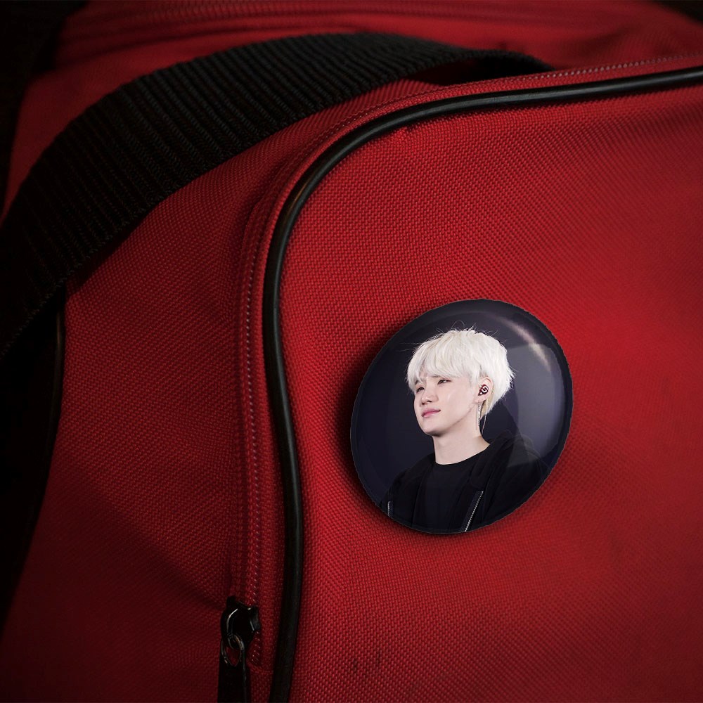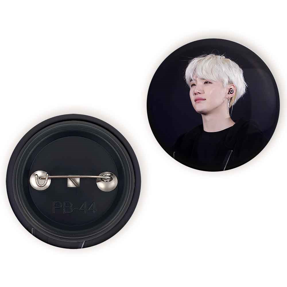 پیکسل 44 میلی متری شوگا Suga گروه بی تی اس BTS خندالو با روکش سلفون حرارتی مات مخملی ضدخش و قطعه پشتی رنگی تولید شده است.پلاستیکی پشت پیکسل با سوزن یک تکه ثابت و بدون لغزش و جا به جایی، ایستایی بسیار بهتری نسبت به پشتی فلزی پیکسل دارند که این مهم در تولید این محصول نیز رعایت شده است.