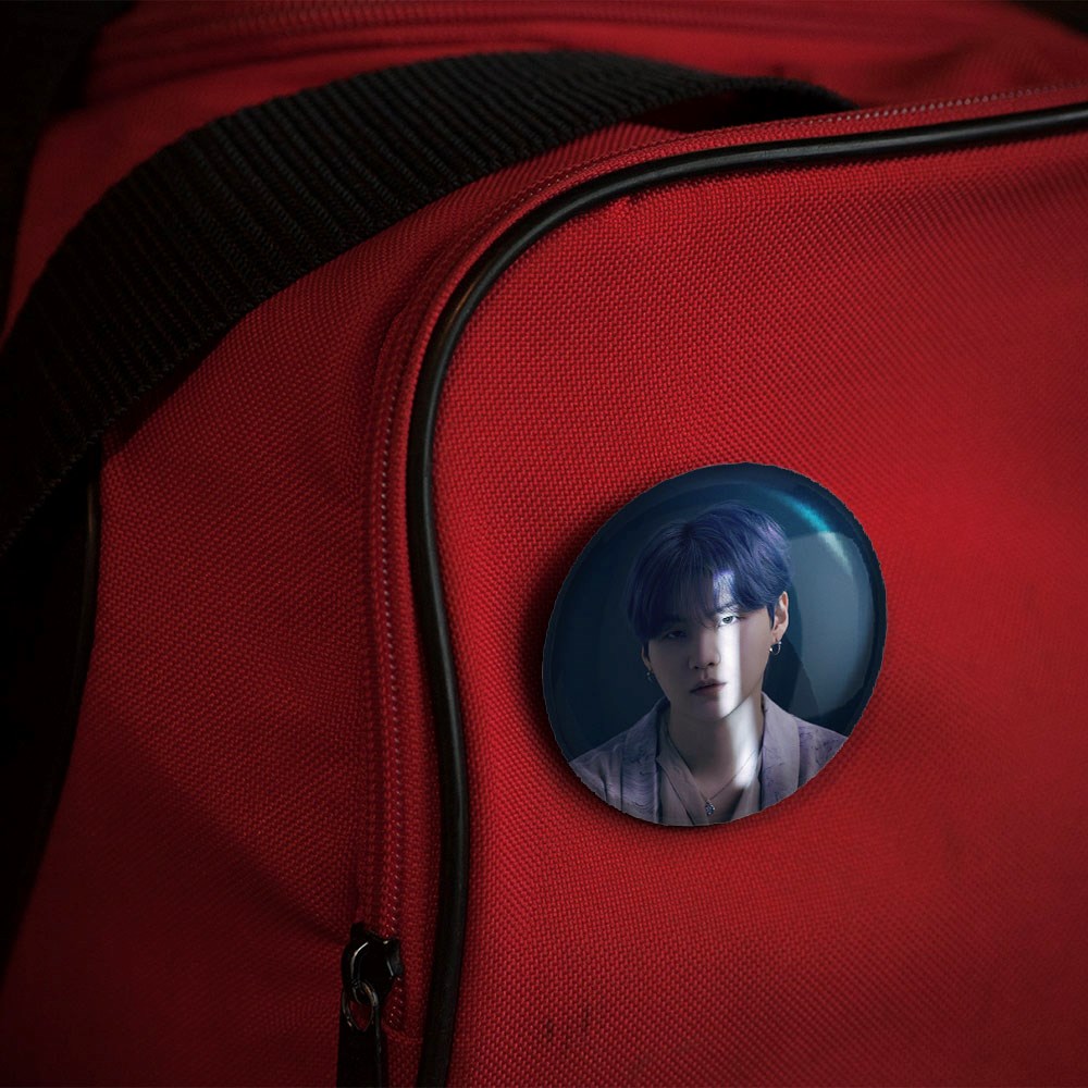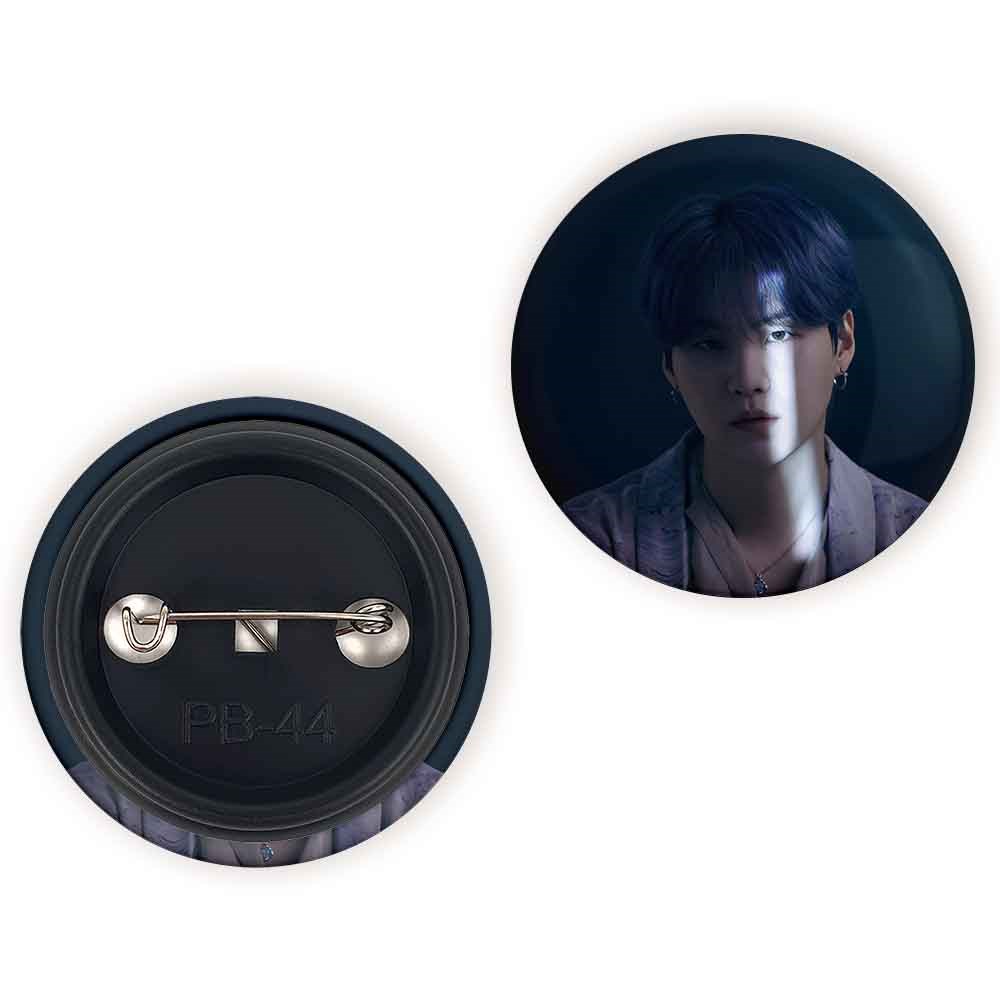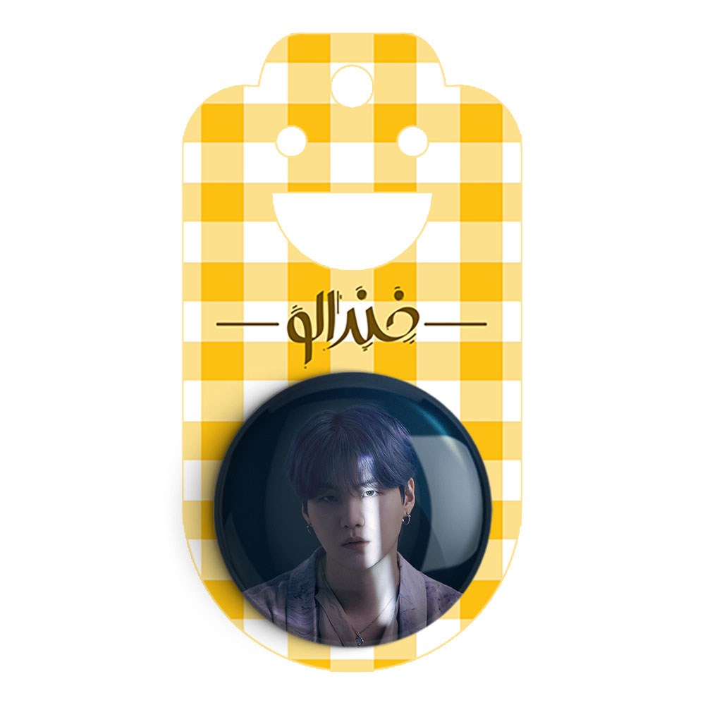پیکسل 44 میلی متری شوگا Suga گروه بی تی اس BTS خندالو با روکش سلفون حرارتی مات مخملی ضدخش و قطعه پشتی رنگی تولید شده است.پلاستیکی پشت پیکسل با سوزن یک تکه ثابت و بدون لغزش و جا به جایی، ایستایی بسیار بهتری نسبت به پشتی فلزی پیکسل دارند که این مهم در تولید این محصول نیز رعایت شده است.