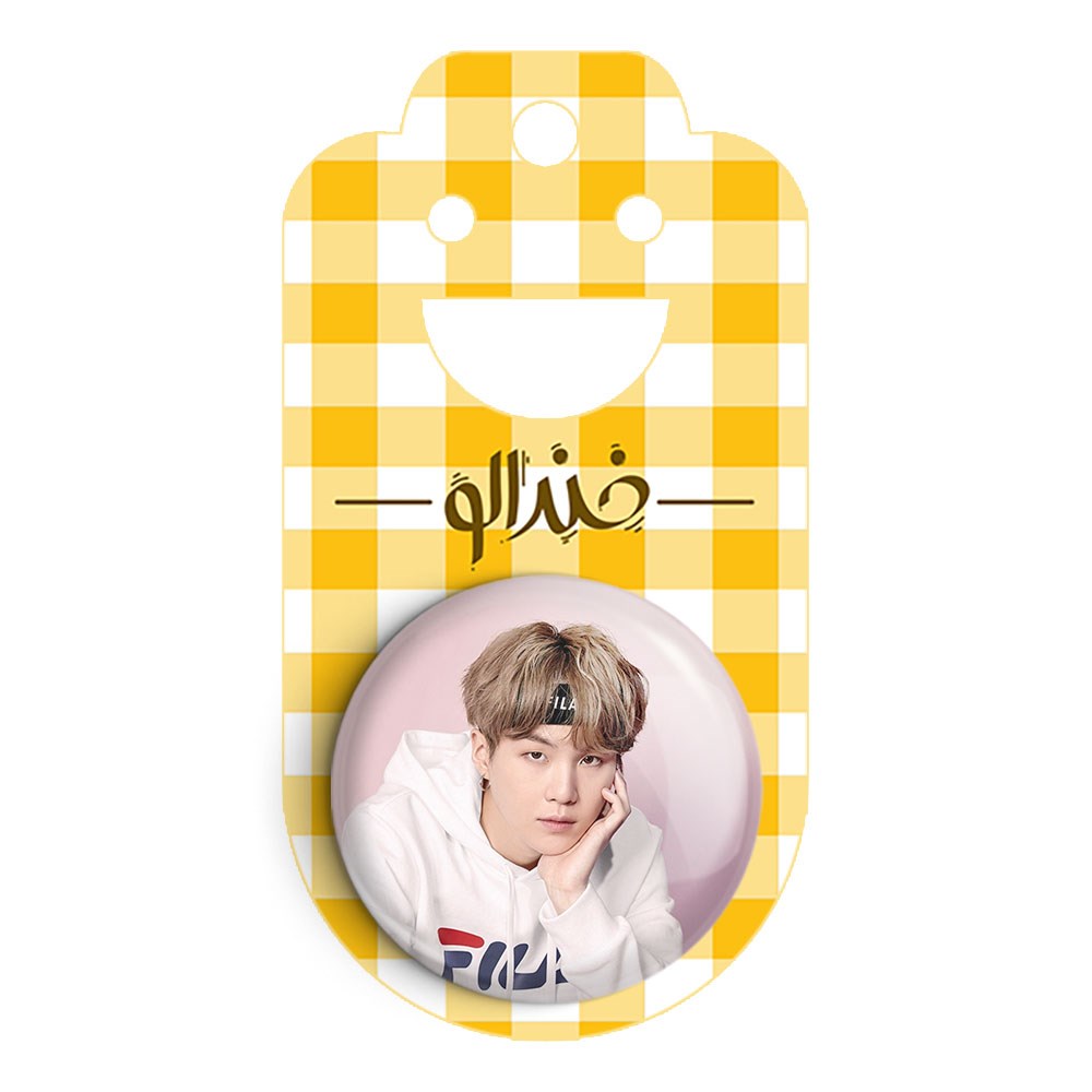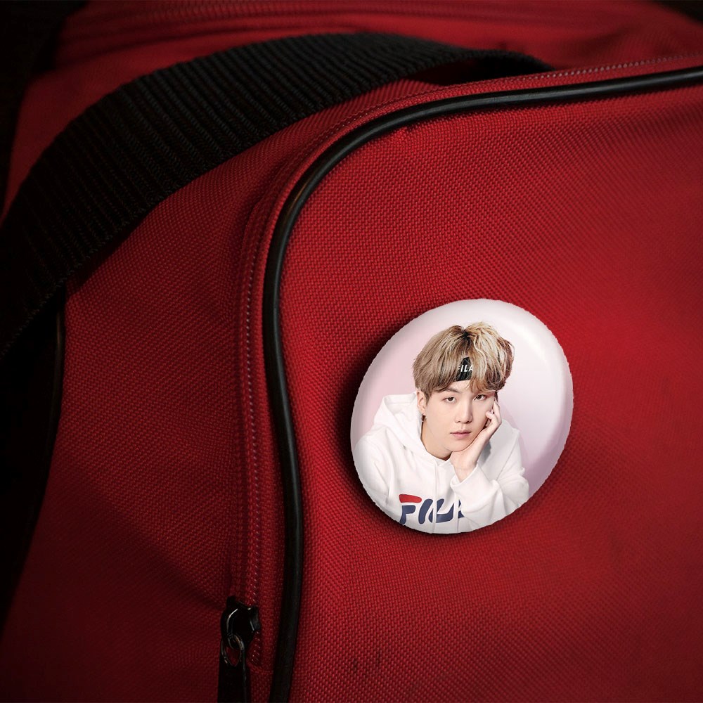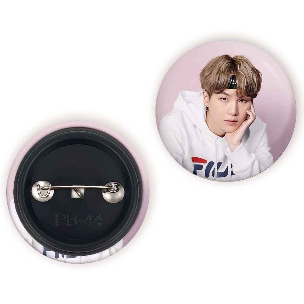 پیکسل 44 میلی متری شوگا Suga گروه بی تی اس BTS خندالو با روکش سلفون حرارتی مات مخملی ضدخش و قطعه پشتی رنگی تولید شده است.پلاستیکی پشت پیکسل با سوزن یک تکه ثابت و بدون لغزش و جا به جایی، ایستایی بسیار بهتری نسبت به پشتی فلزی پیکسل دارند که این مهم در تولید این محصول نیز رعایت شده است.