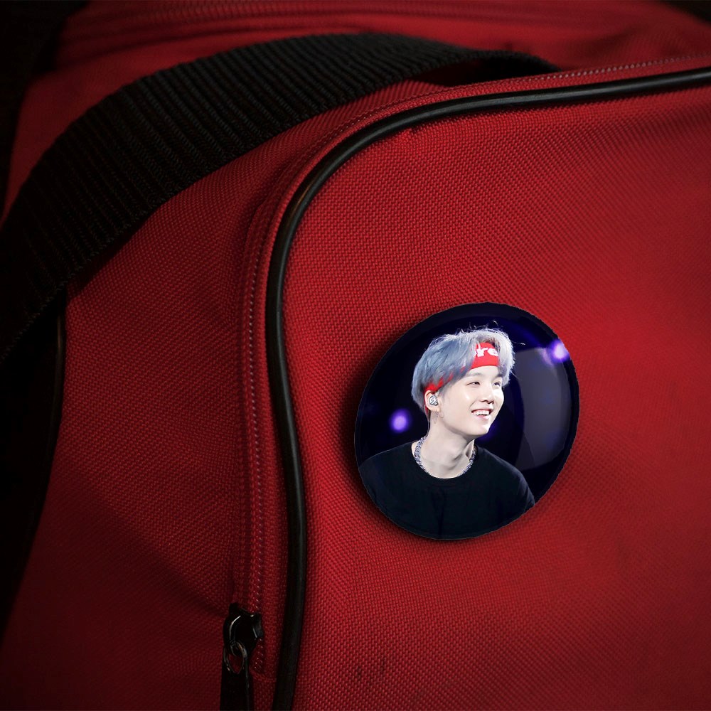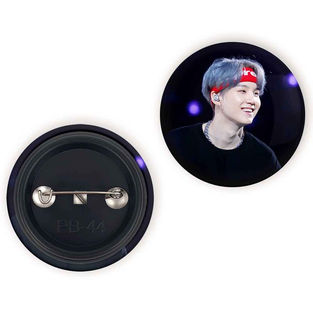 پیکسل 44 میلی متری شوگا Suga گروه بی تی اس BTS خندالو با روکش سلفون حرارتی مات مخملی ضدخش و قطعه پشتی رنگی تولید شده است.پلاستیکی پشت پیکسل با سوزن یک تکه ثابت و بدون لغزش و جا به جایی، ایستایی بسیار بهتری نسبت به پشتی فلزی پیکسل دارند که این مهم در تولید این محصول نیز رعایت شده است.