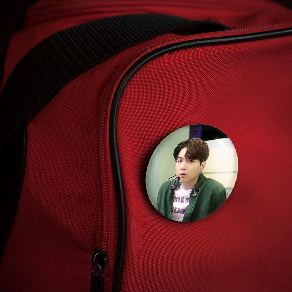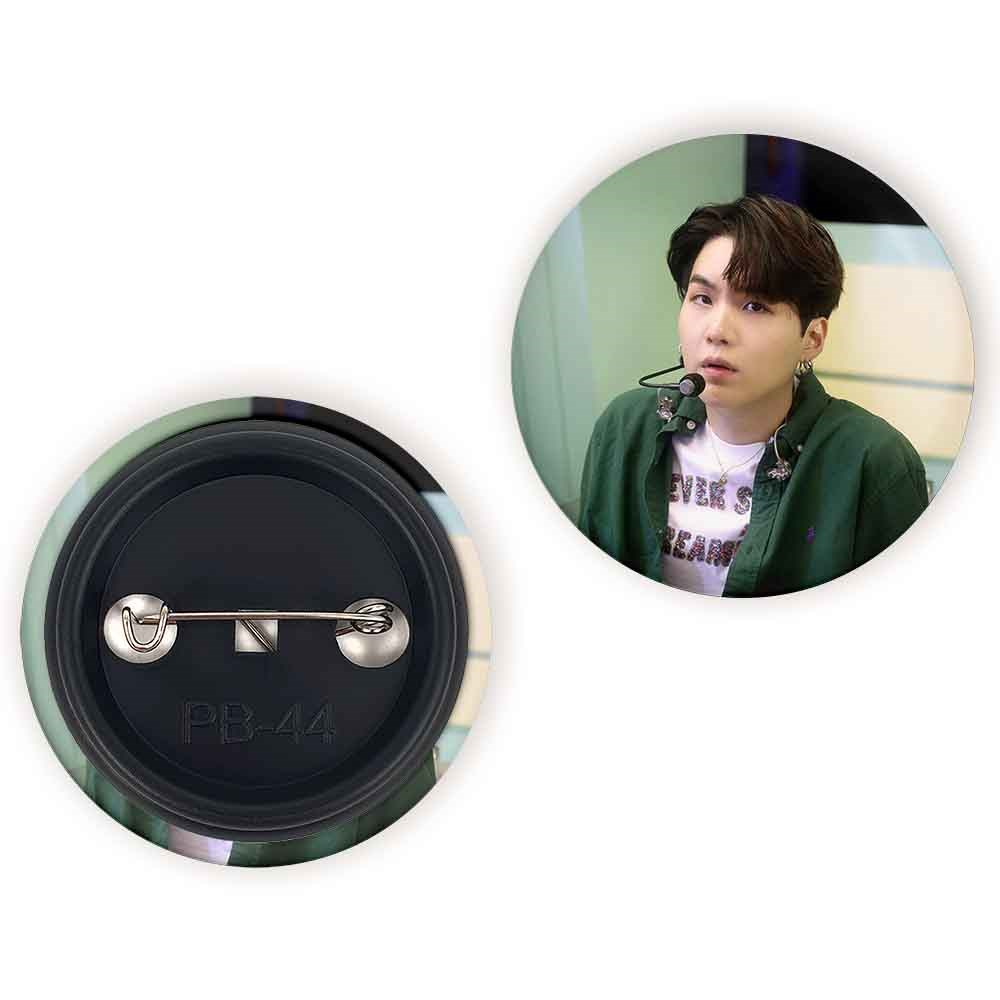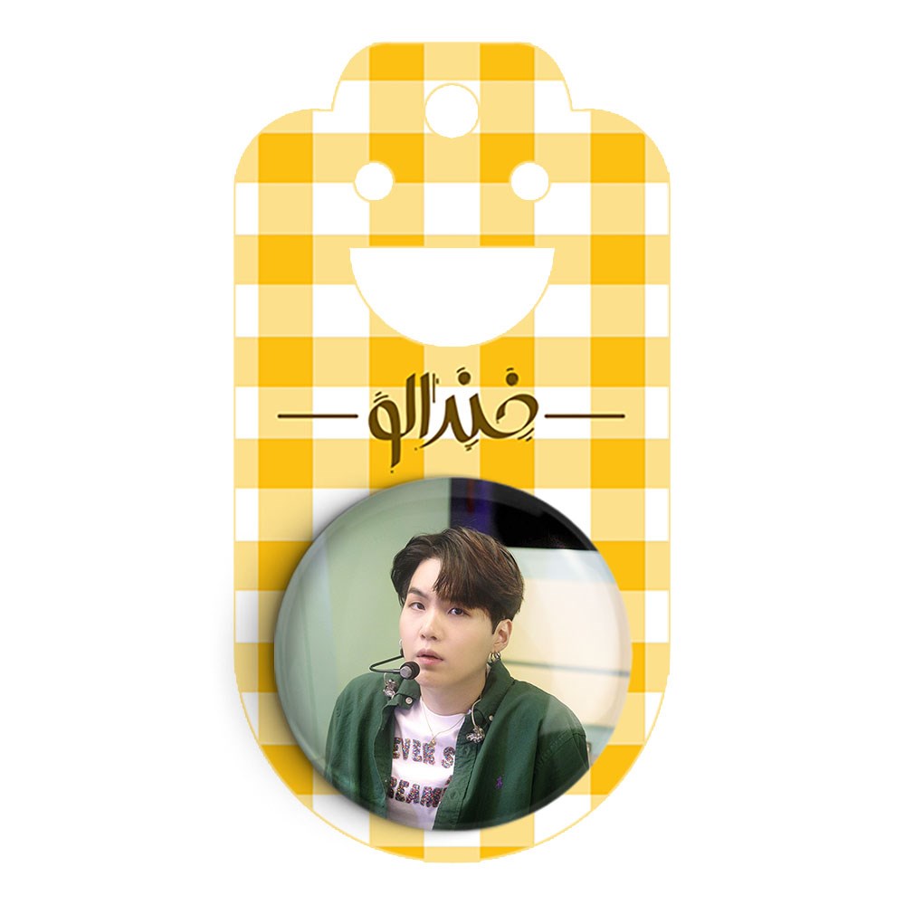 پیکسل 44 میلی متری شوگا Suga گروه بی تی اس BTS خندالو با روکش سلفون حرارتی مات مخملی ضدخش و قطعه پشتی رنگی تولید شده است.پلاستیکی پشت پیکسل با سوزن یک تکه ثابت و بدون لغزش و جا به جایی، ایستایی بسیار بهتری نسبت به پشتی فلزی پیکسل دارند که این مهم در تولید این محصول نیز رعایت شده است.
