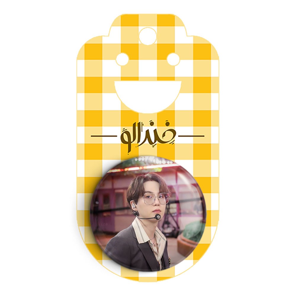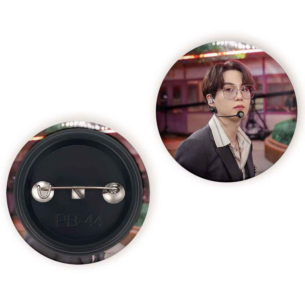پیکسل 44 میلی متری شوگا Suga گروه بی تی اس BTS خندالو با روکش سلفون حرارتی مات مخملی ضدخش و قطعه پشتی رنگی تولید شده است.پلاستیکی پشت پیکسل با سوزن یک تکه ثابت و بدون لغزش و جا به جایی، ایستایی بسیار بهتری نسبت به پشتی فلزی پیکسل دارند که این مهم در تولید این محصول نیز رعایت شده است.