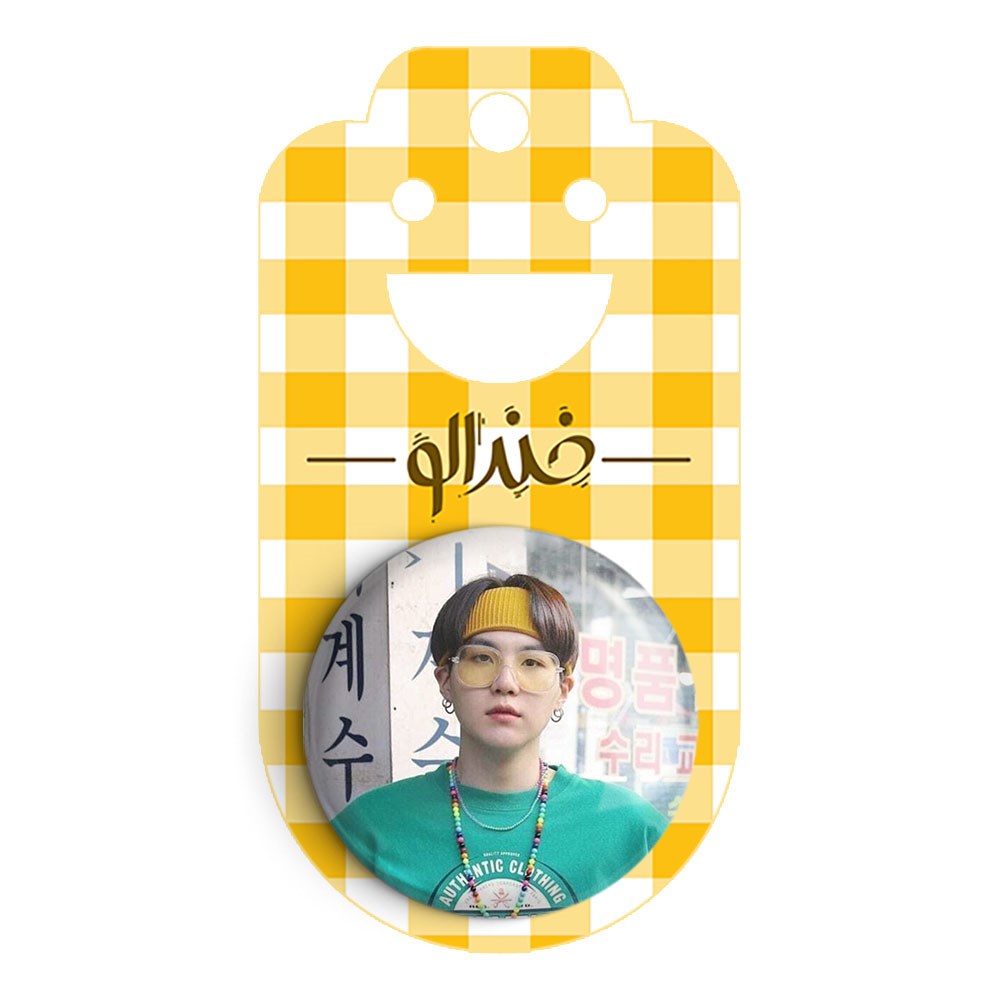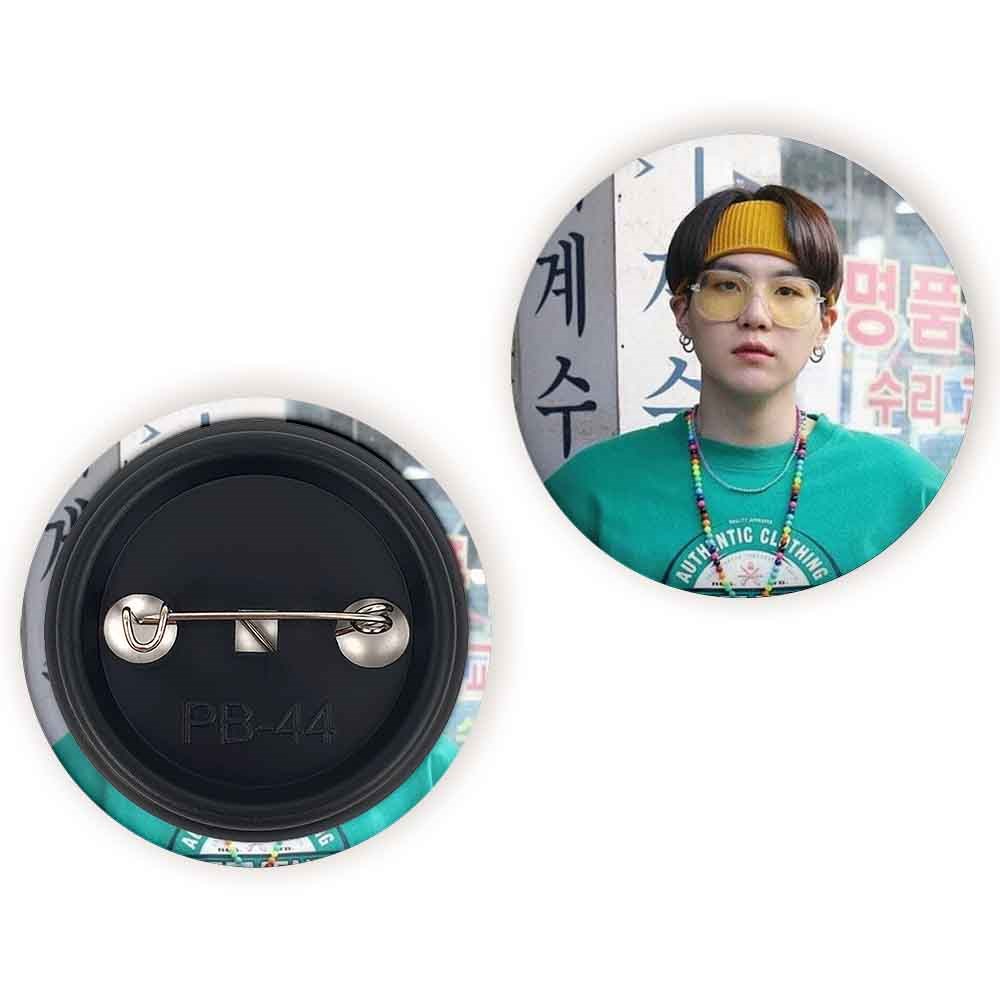 پیکسل 44 میلی متری شوگا Suga گروه بی تی اس BTS خندالو با روکش سلفون حرارتی مات مخملی ضدخش و قطعه پشتی رنگی تولید شده است.پلاستیکی پشت پیکسل با سوزن یک تکه ثابت و بدون لغزش و جا به جایی، ایستایی بسیار بهتری نسبت به پشتی فلزی پیکسل دارند که این مهم در تولید این محصول نیز رعایت شده است.