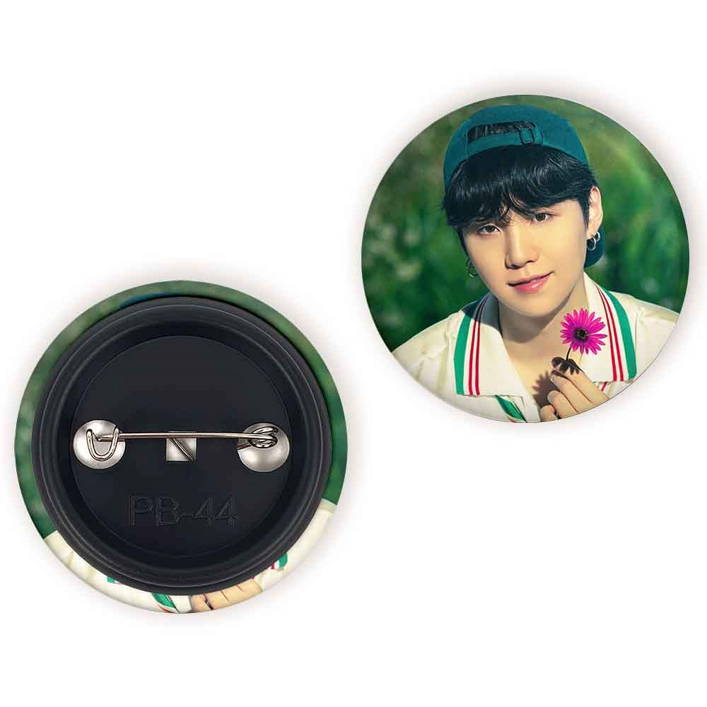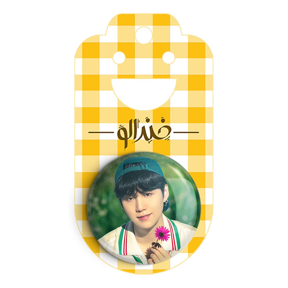 پیکسل 44 میلی متری شوگا Suga گروه بی تی اس BTS خندالو با روکش سلفون حرارتی مات مخملی ضدخش و قطعه پشتی رنگی تولید شده است.پلاستیکی پشت پیکسل با سوزن یک تکه ثابت و بدون لغزش و جا به جایی، ایستایی بسیار بهتری نسبت به پشتی فلزی پیکسل دارند که این مهم در تولید این محصول نیز رعایت شده است.