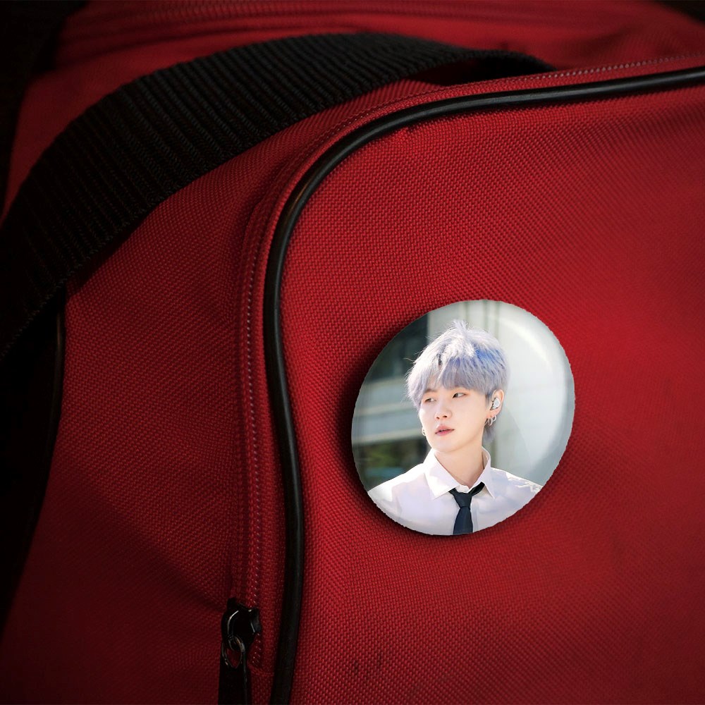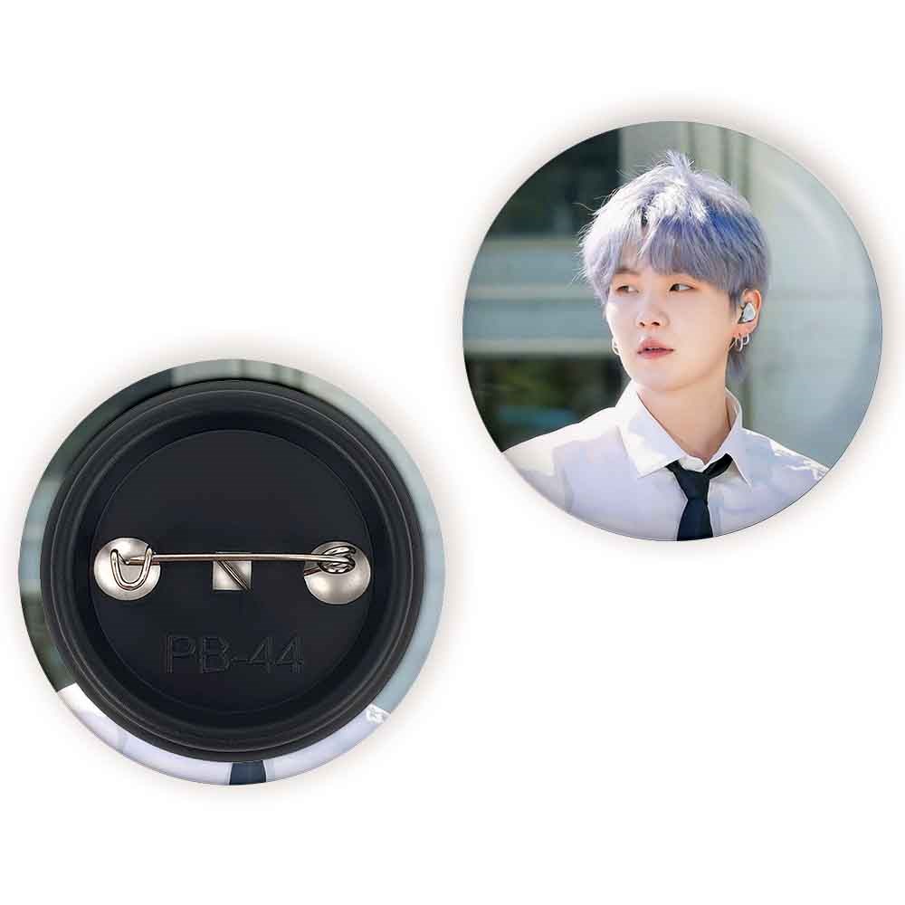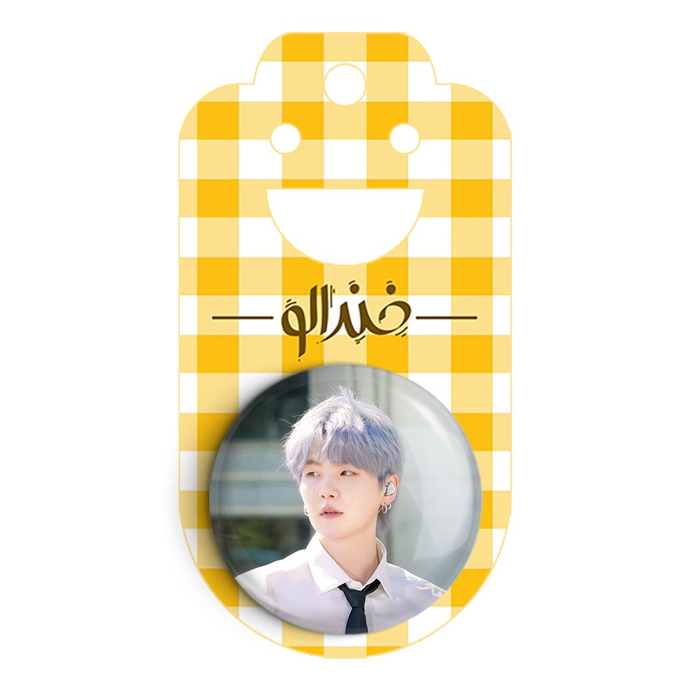 پیکسل 44 میلی متری شوگا Suga گروه بی تی اس BTS خندالو با روکش سلفون حرارتی مات مخملی ضدخش و قطعه پشتی رنگی تولید شده است.پلاستیکی پشت پیکسل با سوزن یک تکه ثابت و بدون لغزش و جا به جایی، ایستایی بسیار بهتری نسبت به پشتی فلزی پیکسل دارند که این مهم در تولید این محصول نیز رعایت شده است.