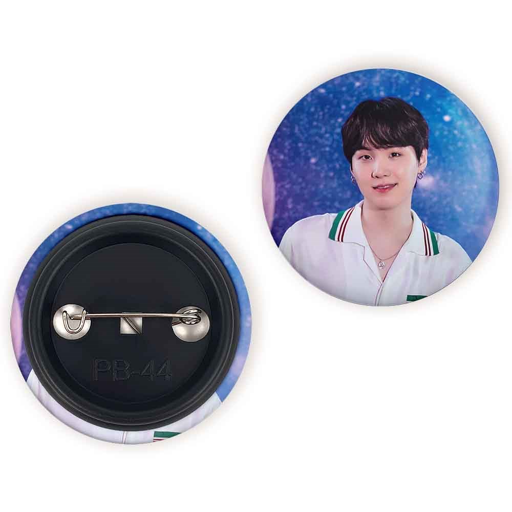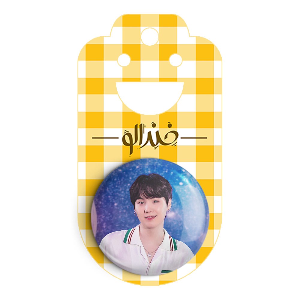 پیکسل 44 میلی متری شوگا Suga گروه بی تی اس BTS خندالو با روکش سلفون حرارتی مات مخملی ضدخش و قطعه پشتی رنگی تولید شده است.پلاستیکی پشت پیکسل با سوزن یک تکه ثابت و بدون لغزش و جا به جایی، ایستایی بسیار بهتری نسبت به پشتی فلزی پیکسل دارند که این مهم در تولید این محصول نیز رعایت شده است.