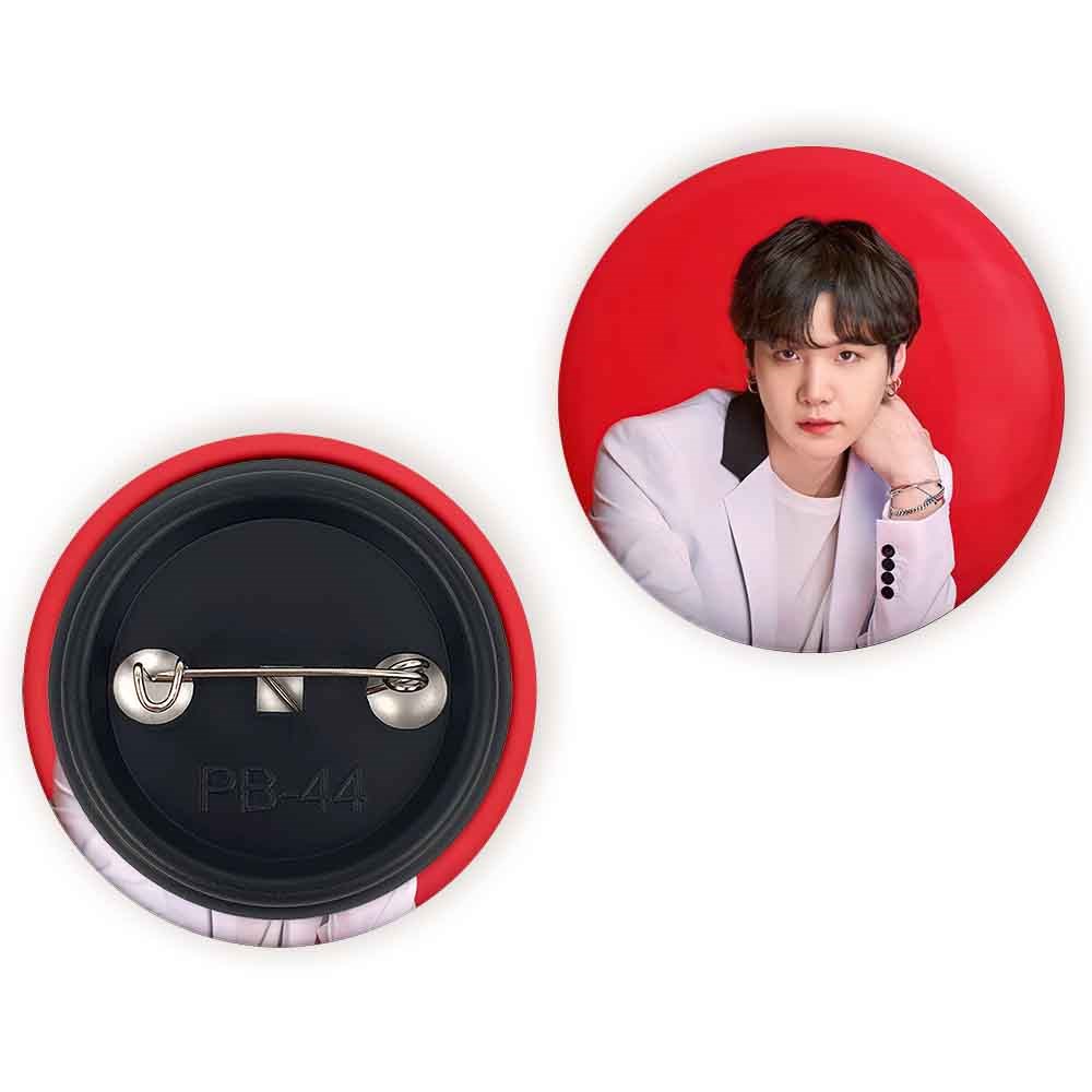 پیکسل 44 میلی متری شوگا Suga گروه بی تی اس BTS خندالو با روکش سلفون حرارتی مات مخملی ضدخش و قطعه پشتی رنگی تولید شده است.پلاستیکی پشت پیکسل با سوزن یک تکه ثابت و بدون لغزش و جا به جایی، ایستایی بسیار بهتری نسبت به پشتی فلزی پیکسل دارند که این مهم در تولید این محصول نیز رعایت شده است.