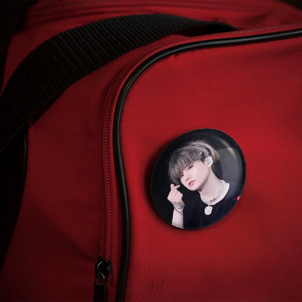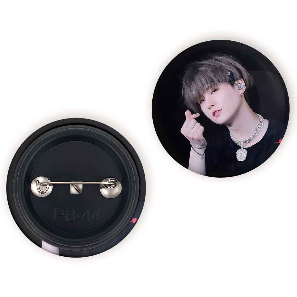 پیکسل 44 میلی متری شوگا Suga گروه بی تی اس BTS خندالو با روکش سلفون حرارتی مات مخملی ضدخش و قطعه پشتی رنگی تولید شده است.پلاستیکی پشت پیکسل با سوزن یک تکه ثابت و بدون لغزش و جا به جایی، ایستایی بسیار بهتری نسبت به پشتی فلزی پیکسل دارند که این مهم در تولید این محصول نیز رعایت شده است.
