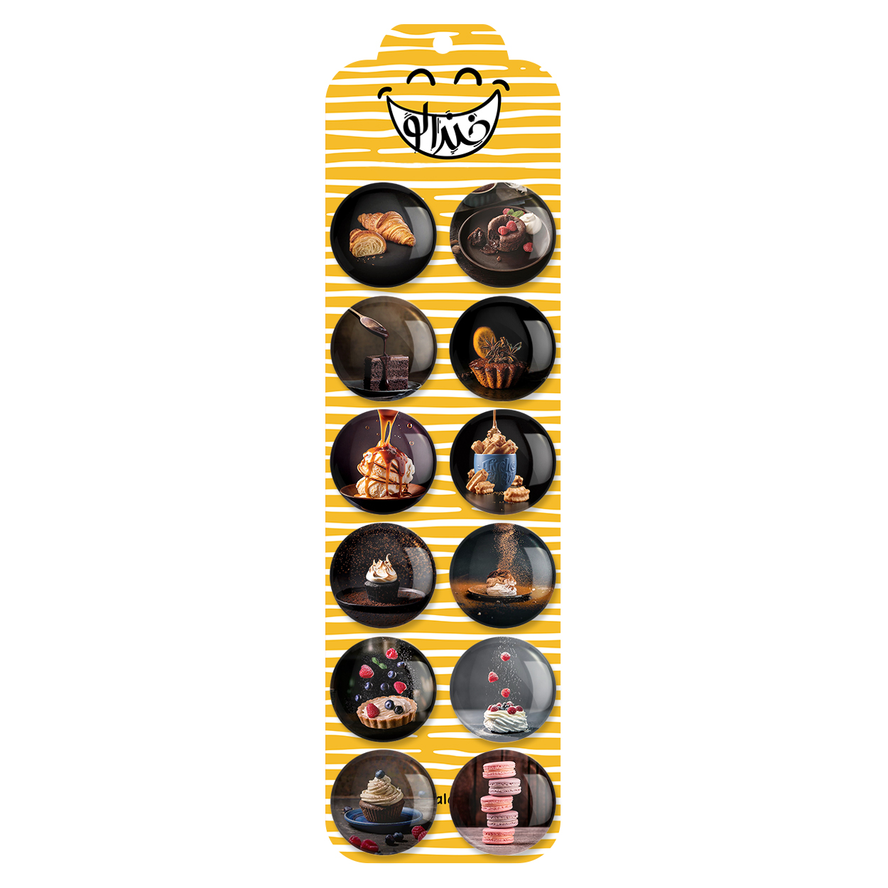 پک 12 عددی پیکسل خندالو طرح شیرینی جات با روکش سلفون حرارتی براق ضدخش و قطعه پشتی رنگی تولید شده است. قطعات پشتی از میان 6 رنگ سفید، مشکی، صورتی، زرد، آبی و قرمز که با توجه به نوع و رنگبندی طرح روی پیکسل انتخاب شده اند تولید می شود و در هر بسته بندی مطابق عکس محصول می باشد. قطعات پلاستیکی پشت پیکسل با سوزن یک تکه ثابت و بدون لغزش و جا به جایی، ایستایی بسیار بهتری نسبت به پشتی فلزی پیکسل دارند که این مهم در تولید این محصول نیز رعایت شده است.