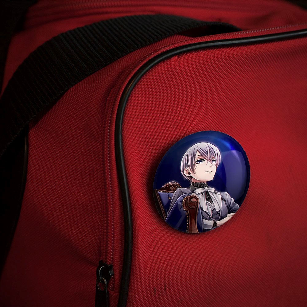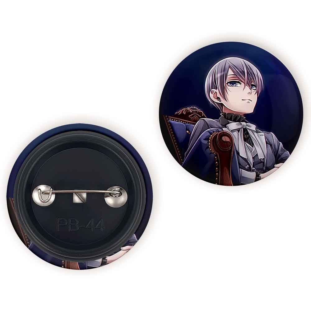 پیکسل 44 میلی متری شیل انیمه خادم سیاه Black Butler خندالو با روکش سلفون حرارتی مات مخملی ضدخش و قطعه پشتی رنگی تولید شده است.پلاستیکی پشت پیکسل با سوزن یک تکه ثابت و بدون لغزش و جا به جایی، ایستایی بسیار بهتری نسبت به پشتی فلزی پیکسل دارند که این مهم در تولید این محصول نیز رعایت شده است.