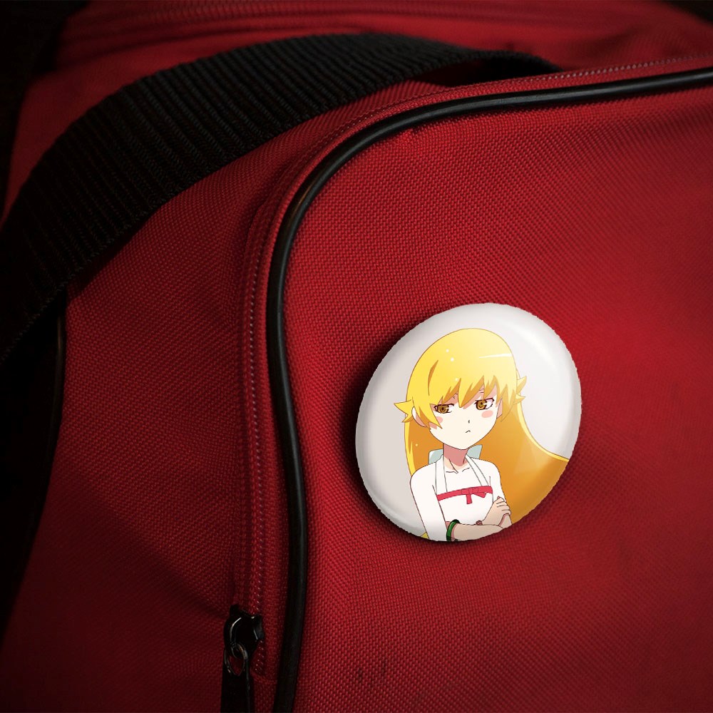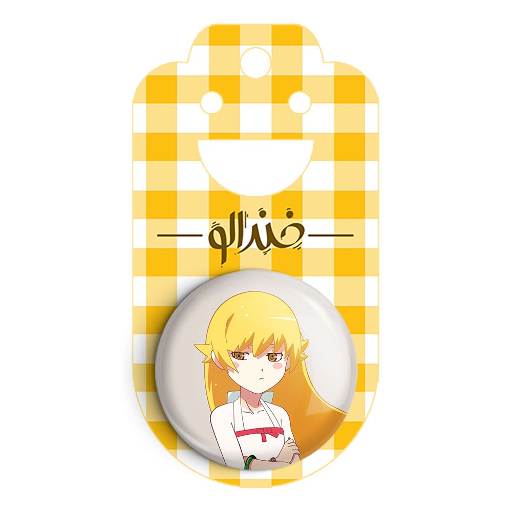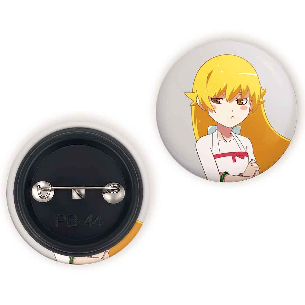پیکسل 44 میلی متری شینوبو اوشینو انیمه مونوگاتاری خندالو با روکش سلفون حرارتی مات مخملی ضدخش و قطعه پشتی رنگی تولید شده است.پلاستیکی پشت پیکسل با سوزن یک تکه ثابت و بدون لغزش و جا به جایی، ایستایی بسیار بهتری نسبت به پشتی فلزی پیکسل دارند که این مهم در تولید این محصول نیز رعایت شده است.