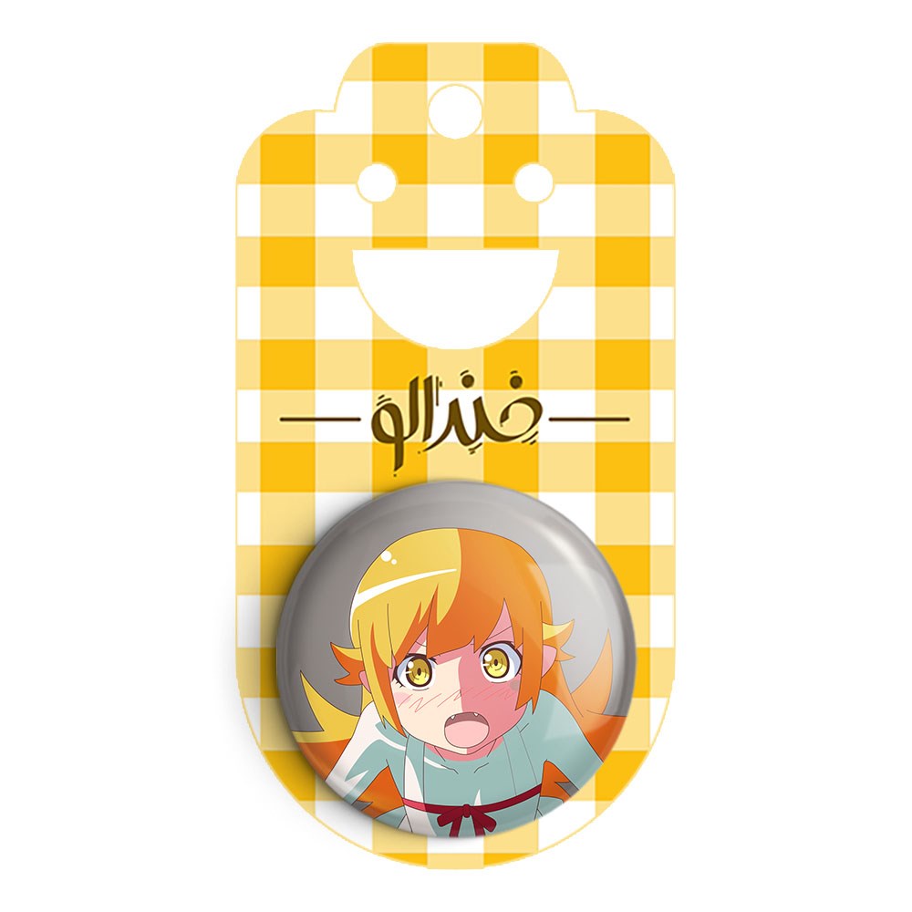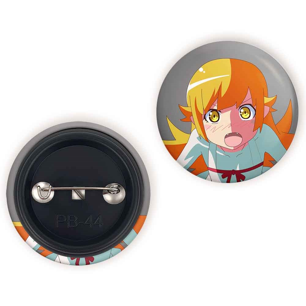 پیکسل 44 میلی متری شینوبو اوشینو انیمه مونوگاتاری خندالو با روکش سلفون حرارتی مات مخملی ضدخش و قطعه پشتی رنگی تولید شده است.پلاستیکی پشت پیکسل با سوزن یک تکه ثابت و بدون لغزش و جا به جایی، ایستایی بسیار بهتری نسبت به پشتی فلزی پیکسل دارند که این مهم در تولید این محصول نیز رعایت شده است.