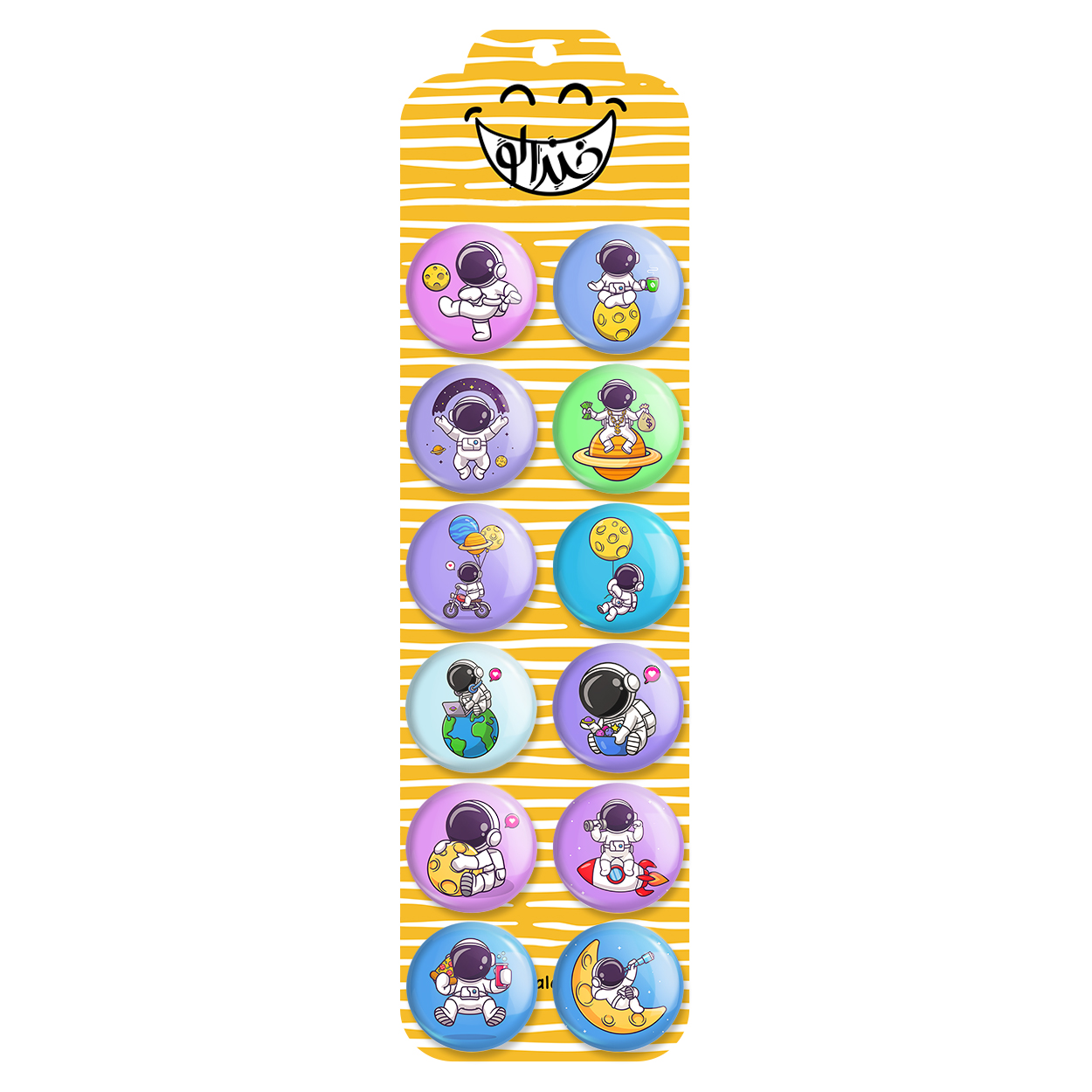 پک 12 عددی پیکسل خندالو طرح فضانورد (astronaut) با روکش سلفون حرارتی براق ضدخش و قطعه پشتی رنگی تولید شده است. قطعات پشتی از میان 6 رنگ سفید، مشکی، صورتی، زرد، آبی و قرمز که با توجه به نوع و رنگبندی طرح روی پیکسل انتخاب شده اند تولید می شود و در هر بسته بندی مطابق عکس محصول می باشد. قطعات پلاستیکی پشت پیکسل با سوزن یک تکه ثابت و بدون لغزش و جا به جایی، ایستایی بسیار بهتری نسبت به پشتی فلزی پیکسل دارند که این مهم در تولید این محصول نیز رعایت شده است.