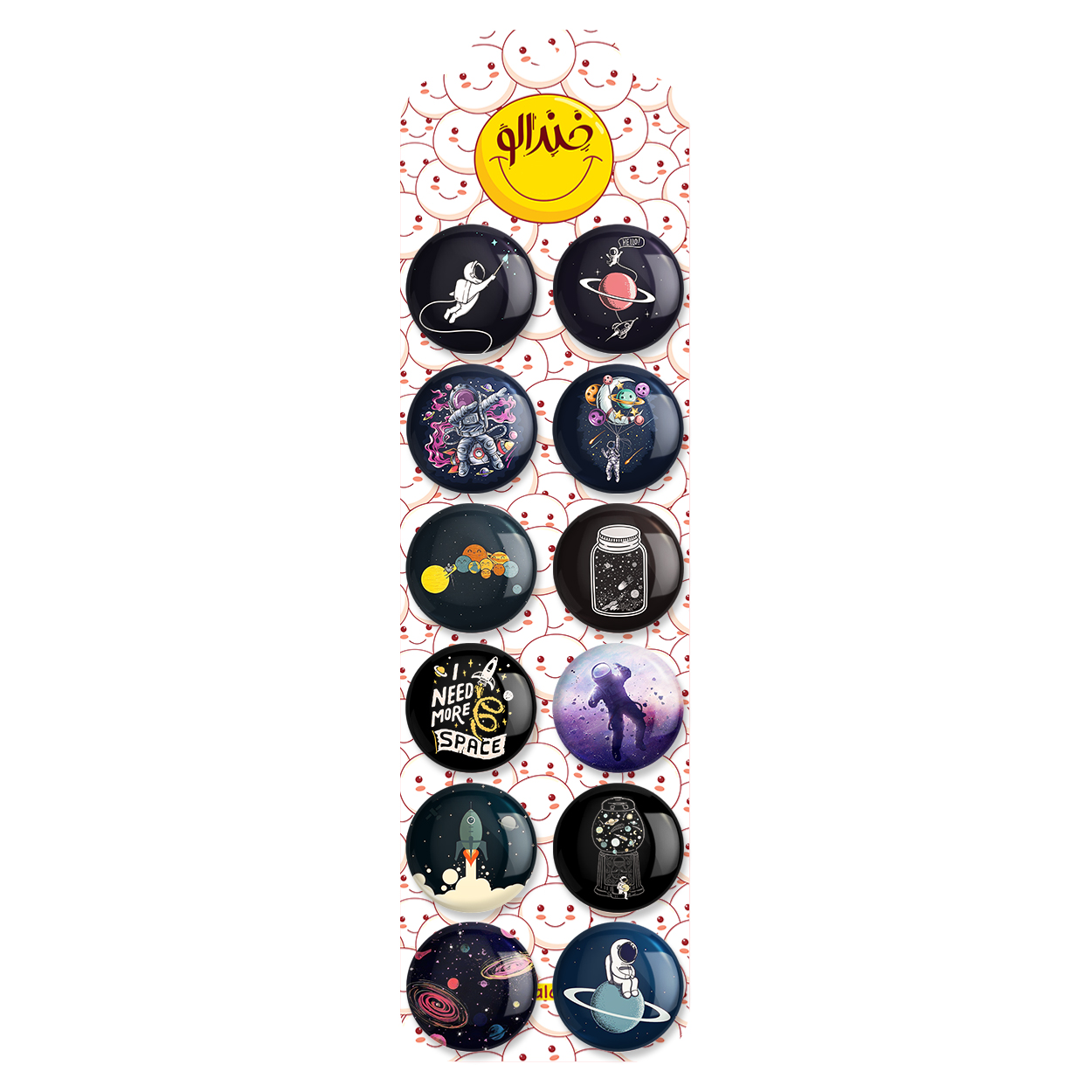 پک 12 عددی پیکسل خندالو طرح فضایی (Spatial) با روکش سلفون حرارتی براق ضدخش و قطعه پشتی رنگی تولید شده است. قطعات پشتی از میان 6 رنگ سفید، مشکی، صورتی، زرد، آبی و قرمز که با توجه به نوع و رنگبندی طرح روی پیکسل انتخاب شده اند تولید می شود و در هر بسته بندی مطابق عکس محصول می باشد. قطعات پلاستیکی پشت پیکسل با سوزن یک تکه ثابت و بدون لغزش و جا به جایی، ایستایی بسیار بهتری نسبت به پشتی فلزی پیکسل دارند که این مهم در تولید این محصول نیز رعایت شده است.