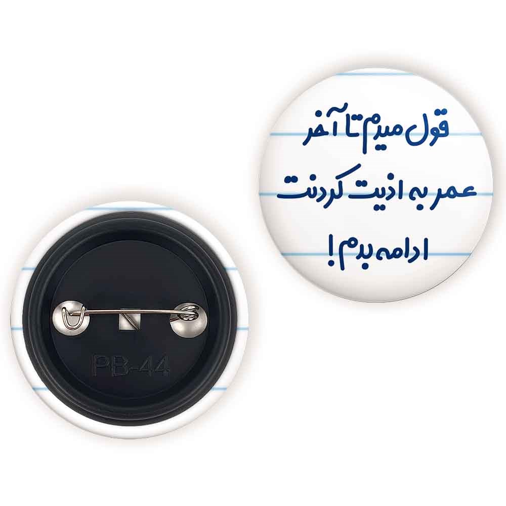 پیکسل 44 میلی متری قول میدم تا آخر عمر به اذیت کردنت ادامه بدم! خندالو با روکش سلفون حرارتی مات مخملی ضدخش و قطعه پشتی رنگی تولید شده است. قطعات پلاستیکی پشت پیکسل با سوزن یک تکه ثابت و بدون لغزش و جا به جایی، ایستایی بسیار بهتری نسبت به پشتی فلزی پیکسل دارند که این مهم در تولید این محصول نیز رعایت شده است. چاپ پیکسل قول میدم تا آخر عمر به اذیت کردنت ادامه بدم! نیز با دستگاه های استاندارد و با بهترین سطح کیفی صورت گرفته و طرح با شفافیتی مثال زدنی و با سلفونی بدون شکست نور بر روی پیکسل نقش بسته است. همچنین بسته بندی جذاب و مینیمال پیکسل قول میدم تا آخر عمر به اذیت کردنت ادامه بدم! ، آنها را مناسب هدیه کرده است.