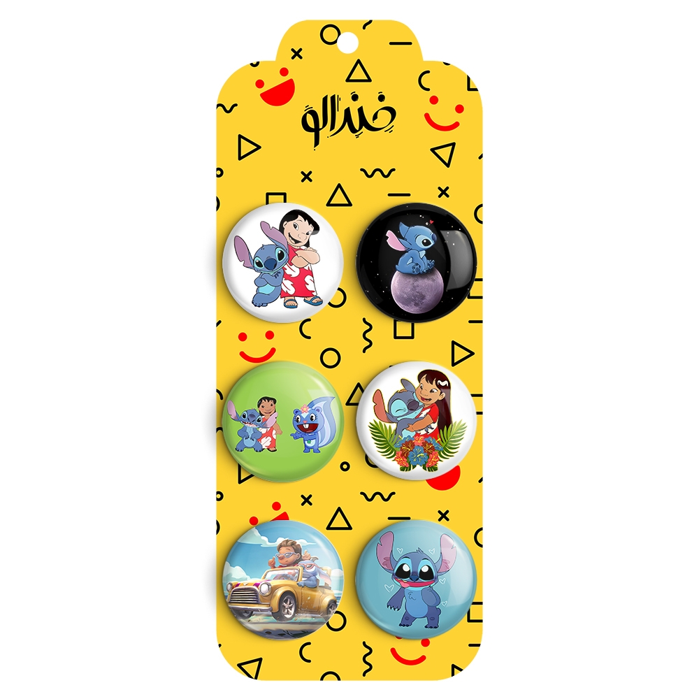 مجموعه 6 عددی پیکسل خندالو طرح لیلو و استیچ با روکش سلفون حرارتی براق ضدخش و قطعه پشتی رنگی تولید شده است. قطعات پشتی از میان 6 رنگ سفید، مشکی، صورتی، زرد، آبی و قرمز که با توجه به نوع و رنگبندی طرح روی پیکسل انتخاب شده اند تولید می شود و در هر بسته بندی مطابق عکس محصول می باشد.