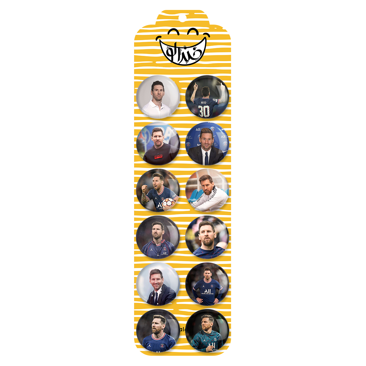 پک 12 عددی پیکسل خندالو طرح لیونل مسی با روکش سلفون حرارتی براق ضدخش و قطعه پشتی رنگی تولید شده است. قطعات پشتی از میان 6 رنگ سفید، مشکی، صورتی، زرد، آبی و قرمز که با توجه به نوع و رنگبندی طرح روی پیکسل انتخاب شده اند تولید می شود و در هر بسته بندی مطابق عکس محصول می باشد. قطعات پلاستیکی پشت پیکسل با سوزن یک تکه ثابت و بدون لغزش و جا به جایی، ایستایی بسیار بهتری نسبت به پشتی فلزی پیکسل دارند که این مهم در تولید این محصول نیز رعایت شده است.